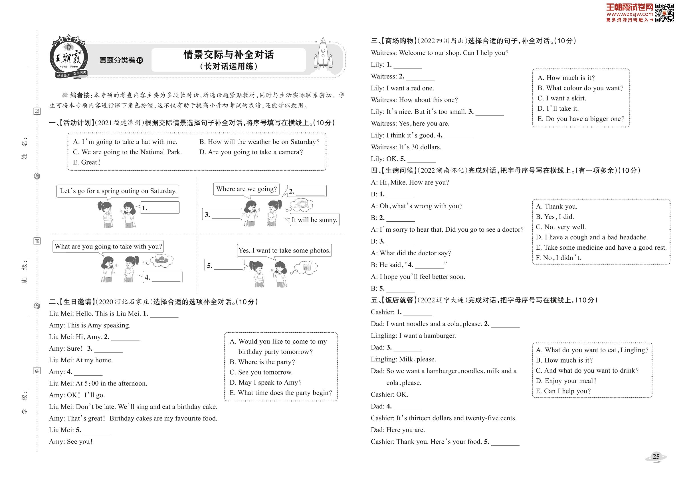 小升初英语真题分类·王朝霞精编卷——情景交际与补全对话(长对话运用练)【13】