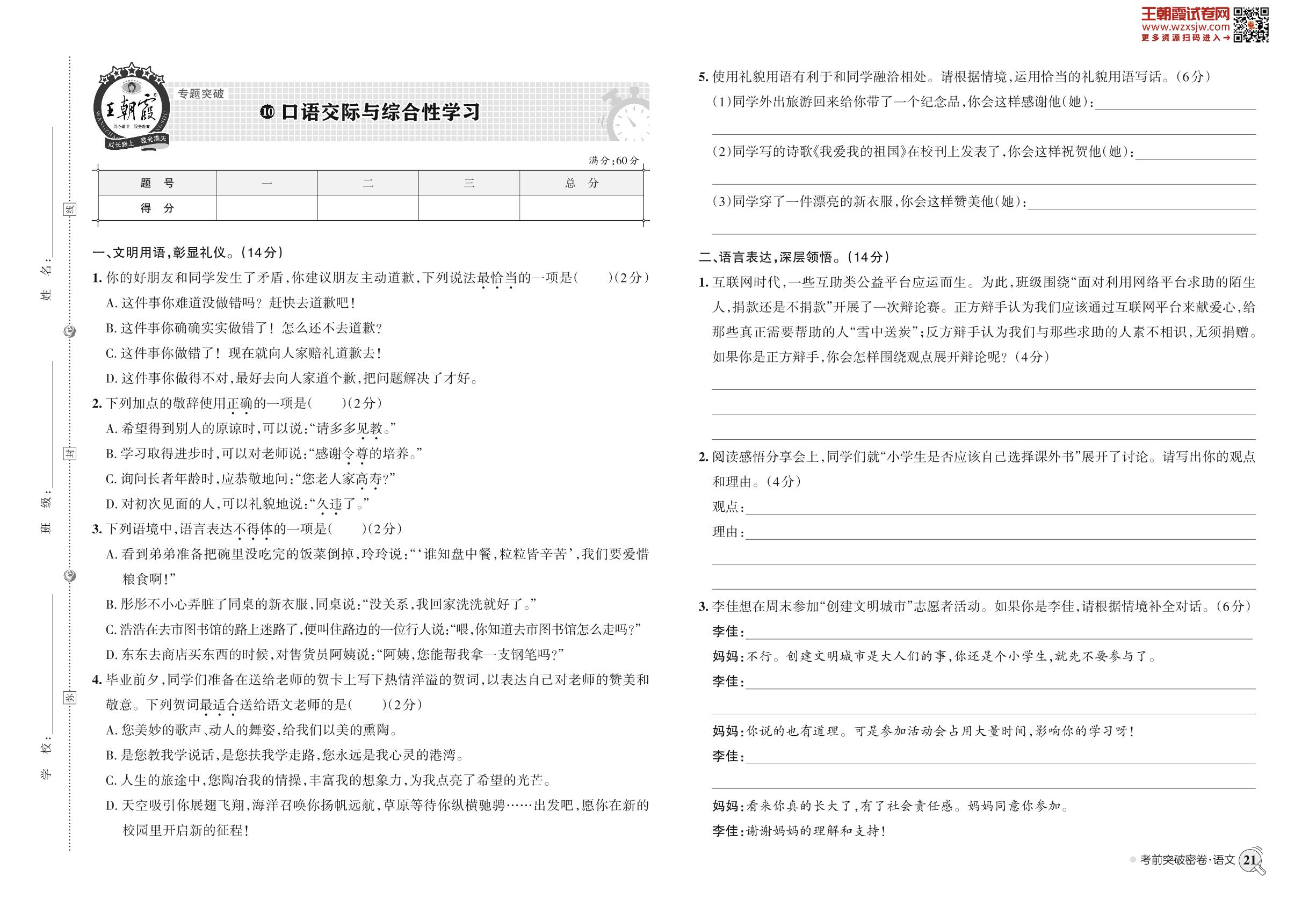 小升初语文·王朝霞专题突破——口语交际与综合性学习【10】