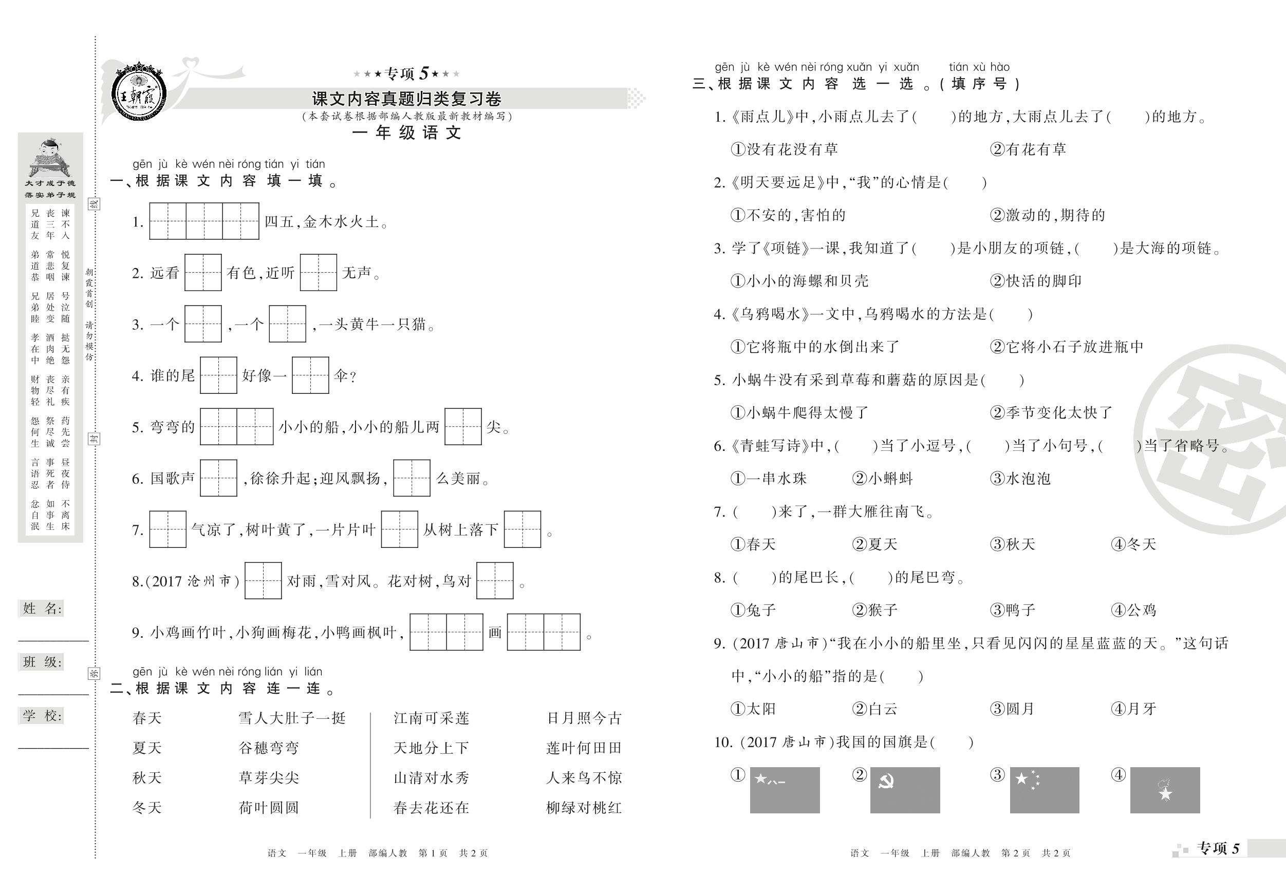 王朝霞期末专项卷——课文内容、积累运用真题归类复习一年级上册语文(人教版)【0】
