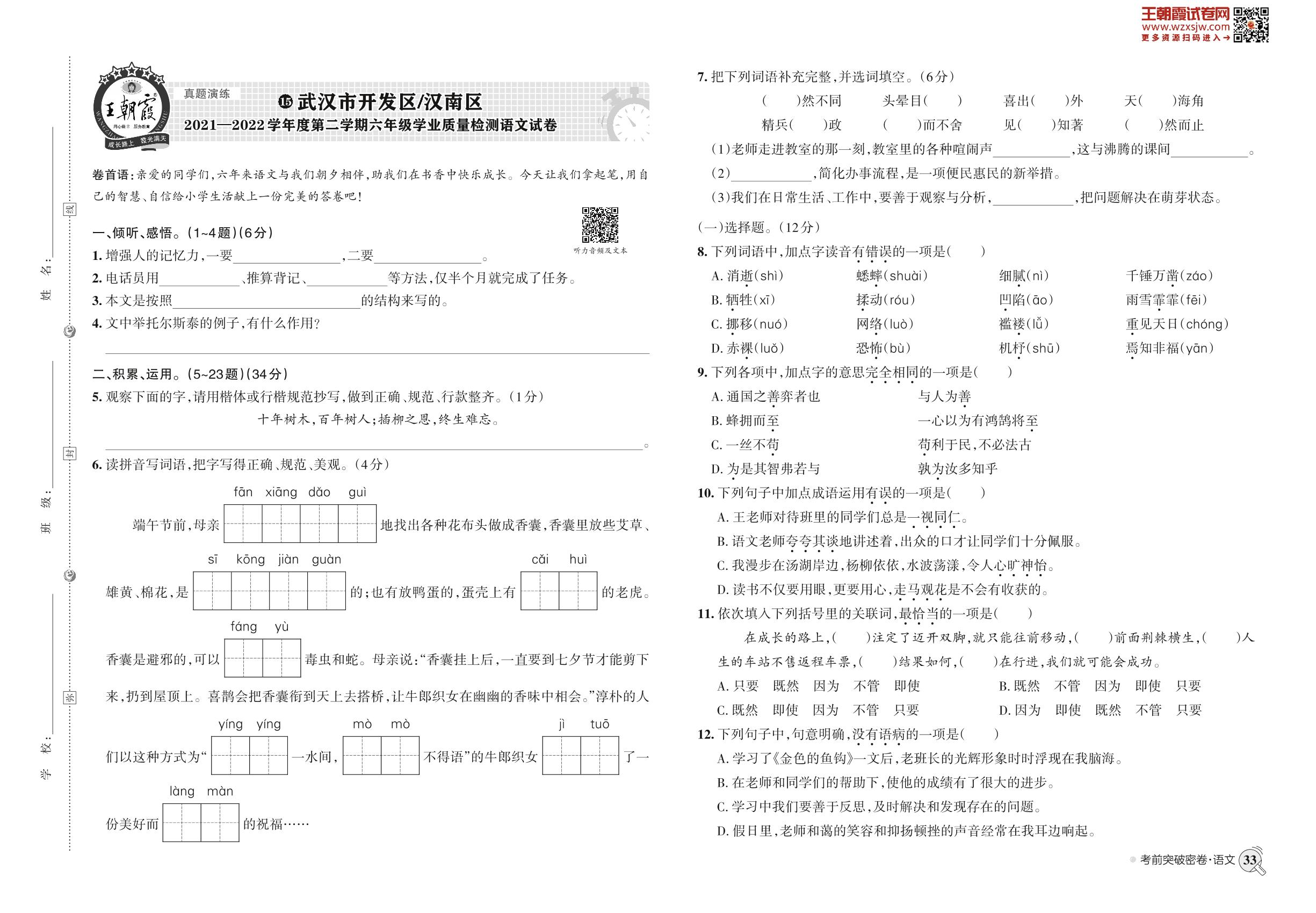 小升初语文武汉市开发区、汉南区2021—2022学年度第二学期六年级学业质量检测语文试卷【15】
