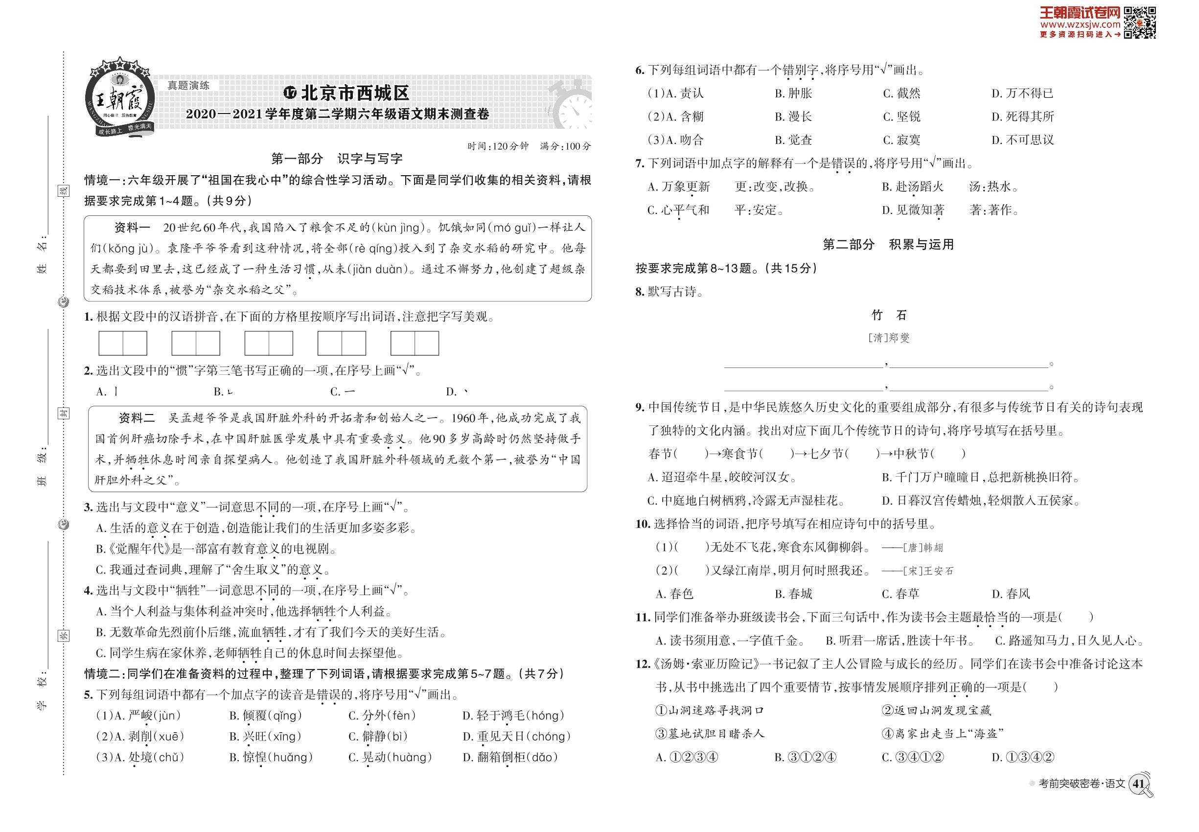 小升初语文北京市西城区2020—2021学年度第二学期六年级语文期末测查卷【17】
