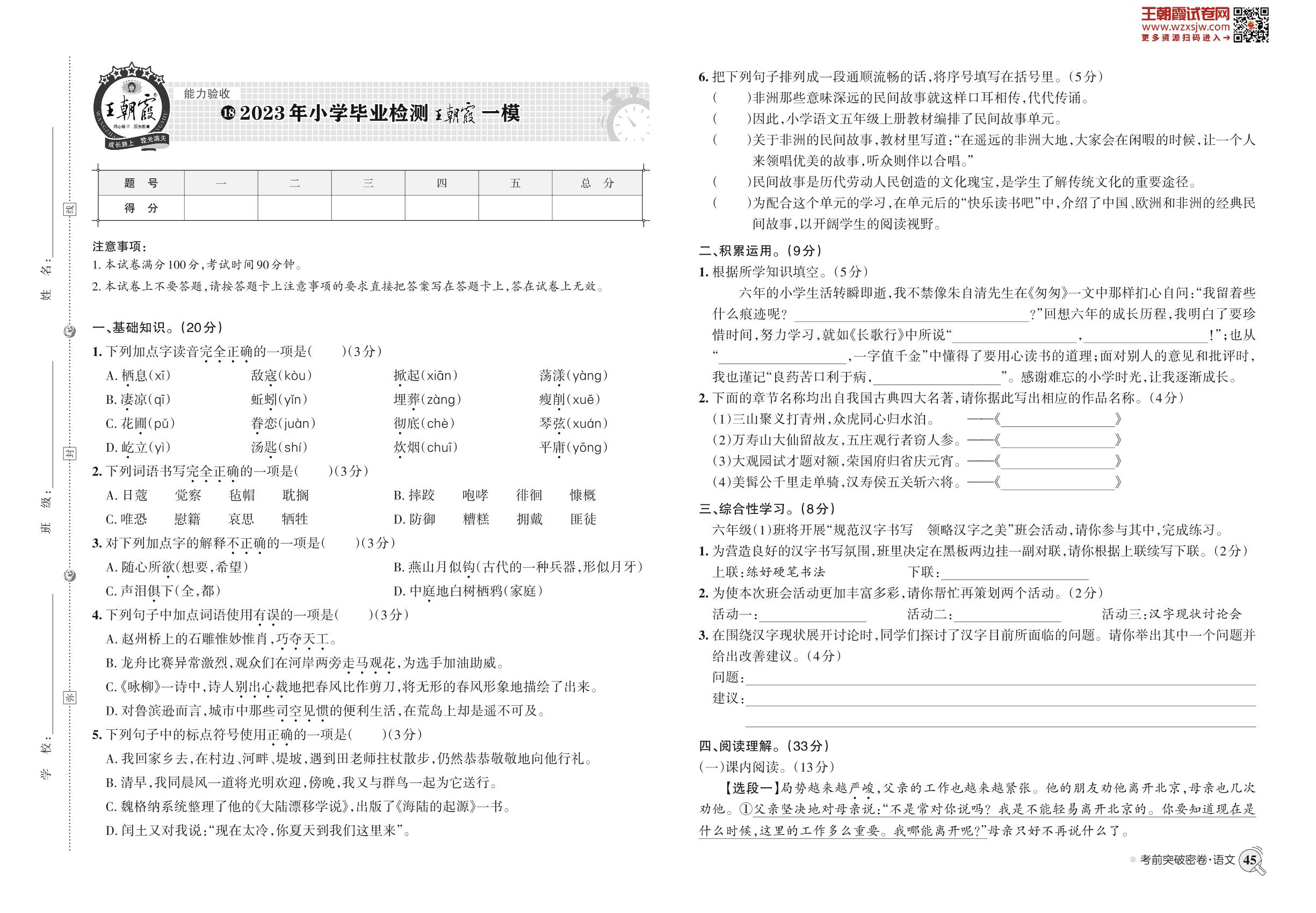 小升初语文小学毕业检测·王朝霞模拟卷_R221225104153773【1】