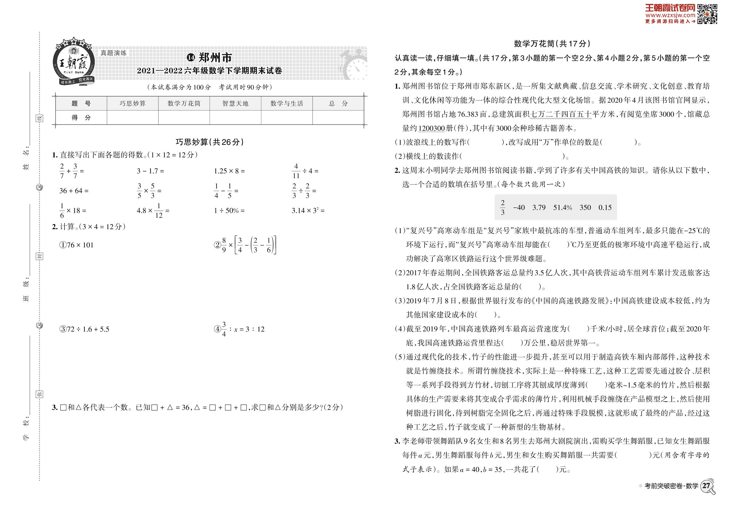 小升初数学郑州市2021—2022六年级数学下学期期末试卷【14】