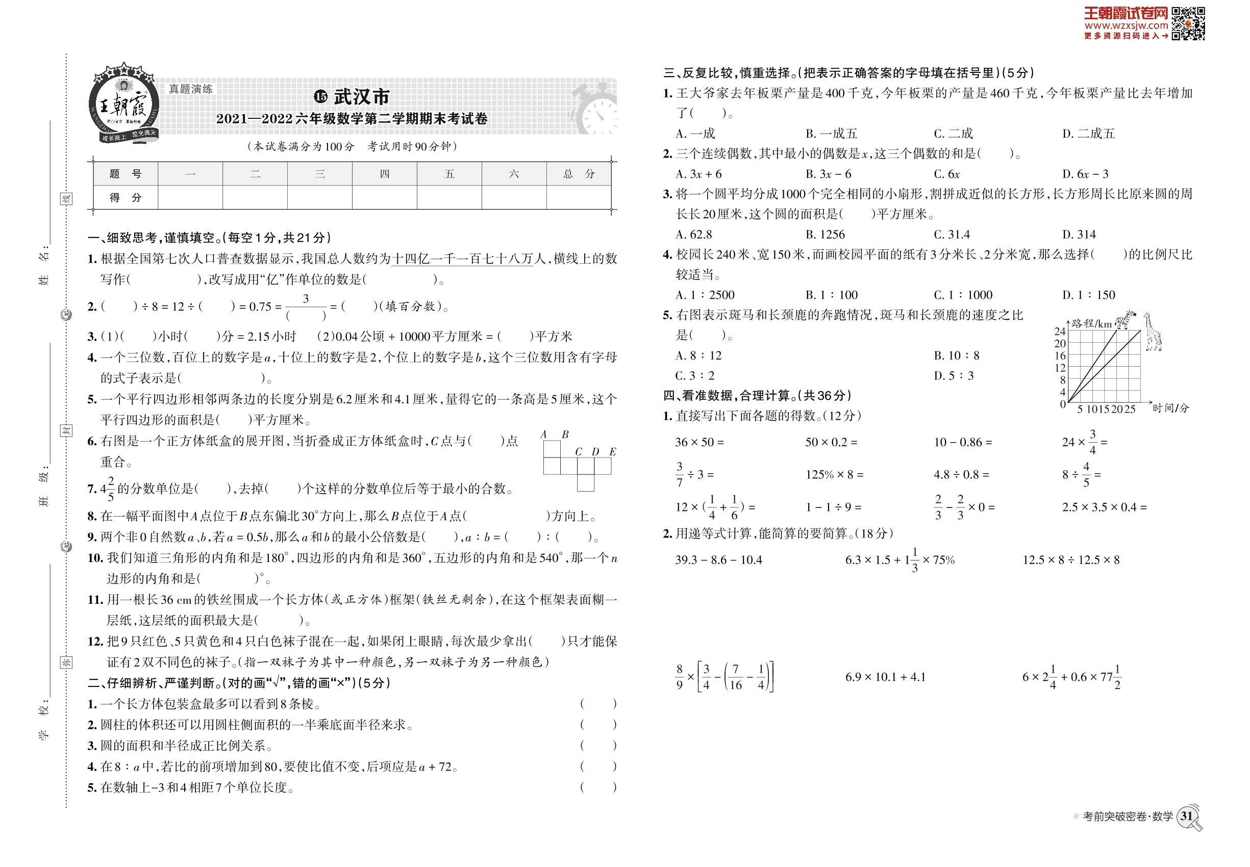 小升初数学武汉市2021—2022六年级数学第二学期期末考试卷【15】