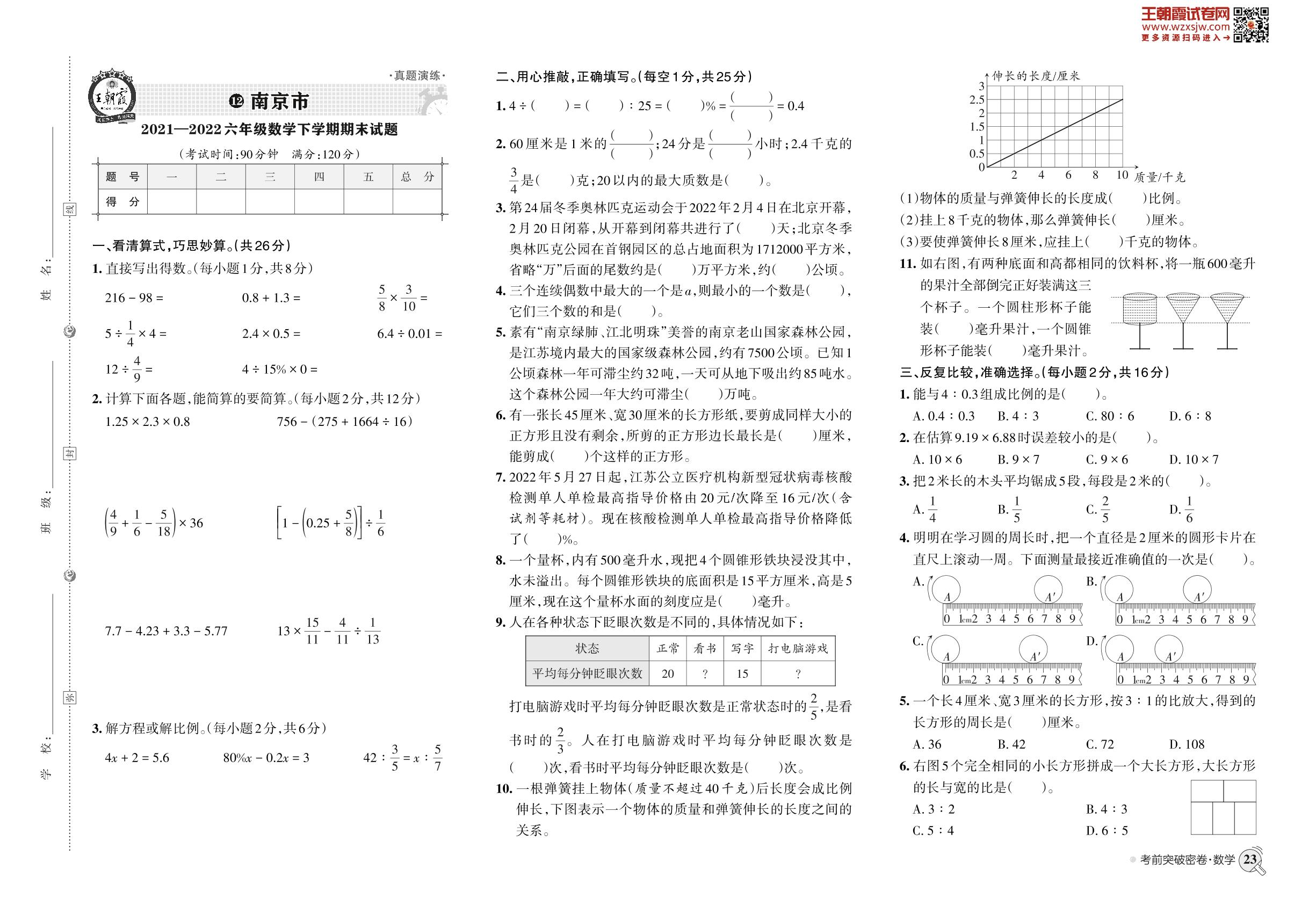 小升初数学南京市2021—2022六年级数学下学期期末试题【12】