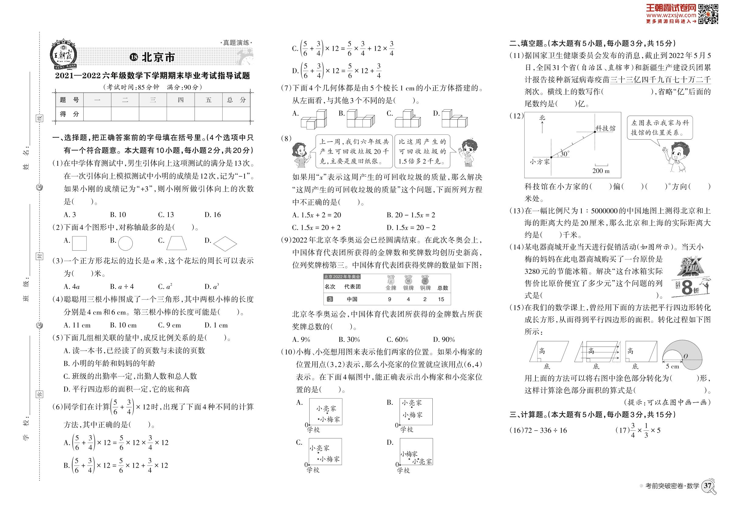 小升初数学北京市2021—2022六年级数学下学期期末毕业考试指导试题【18】