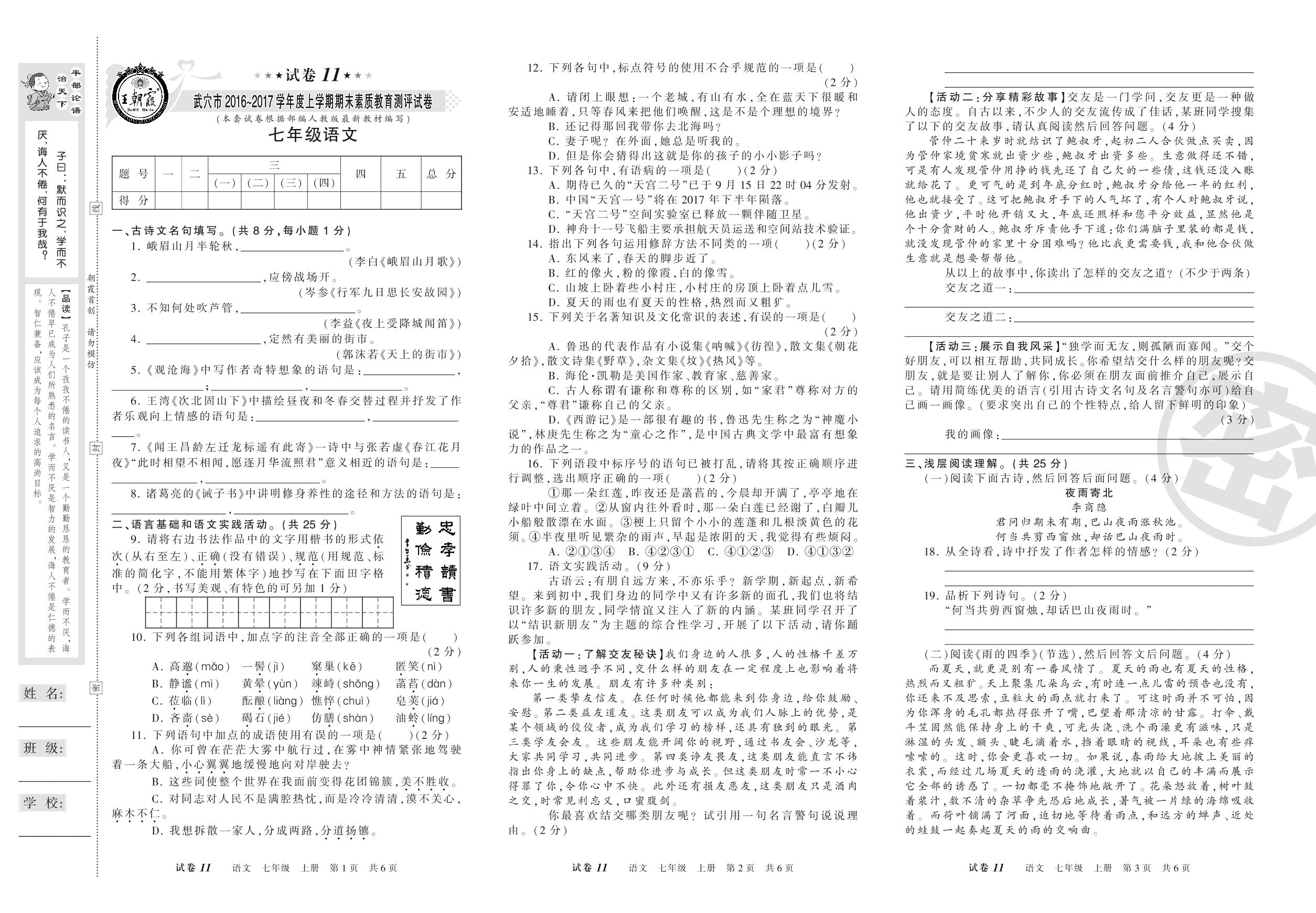 2016-2017学年第一学期武穴市七年级语文试卷(人教版)【11】
