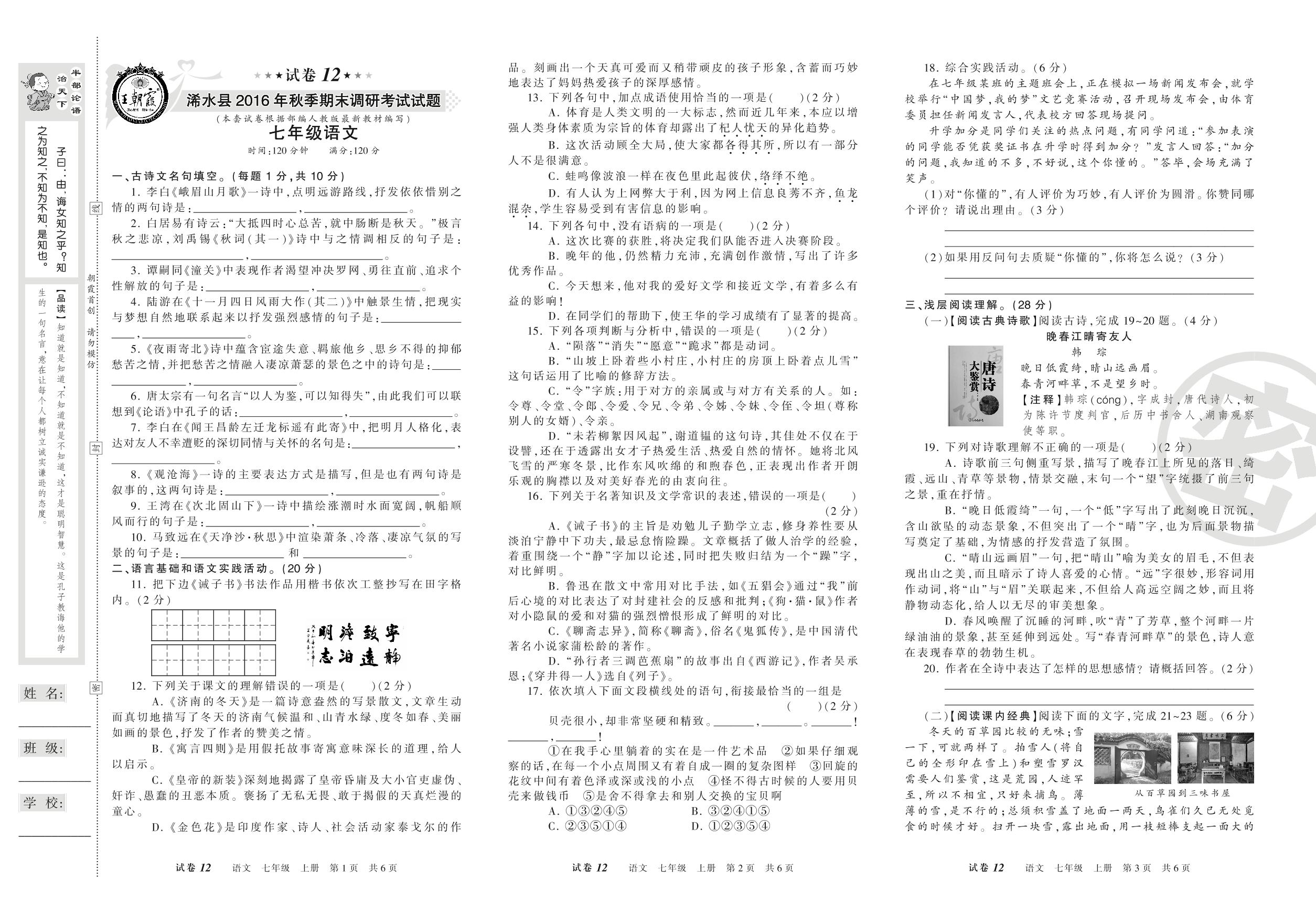2016-2017学年第一学期浠水县七年级语文试卷(人教版)【12】