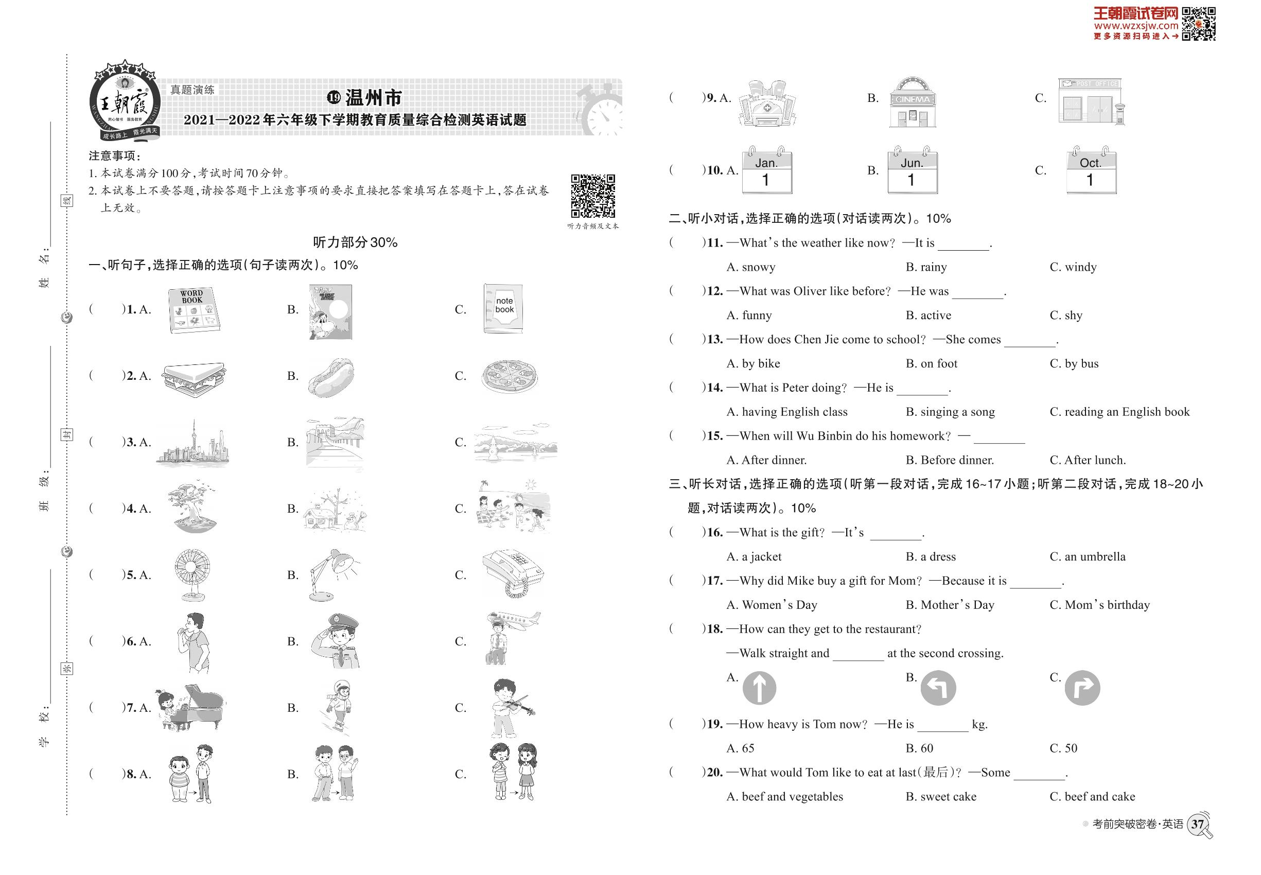小升初英语温州市2021—2022年六年级下学期教育质量综合检测英语试题【19】