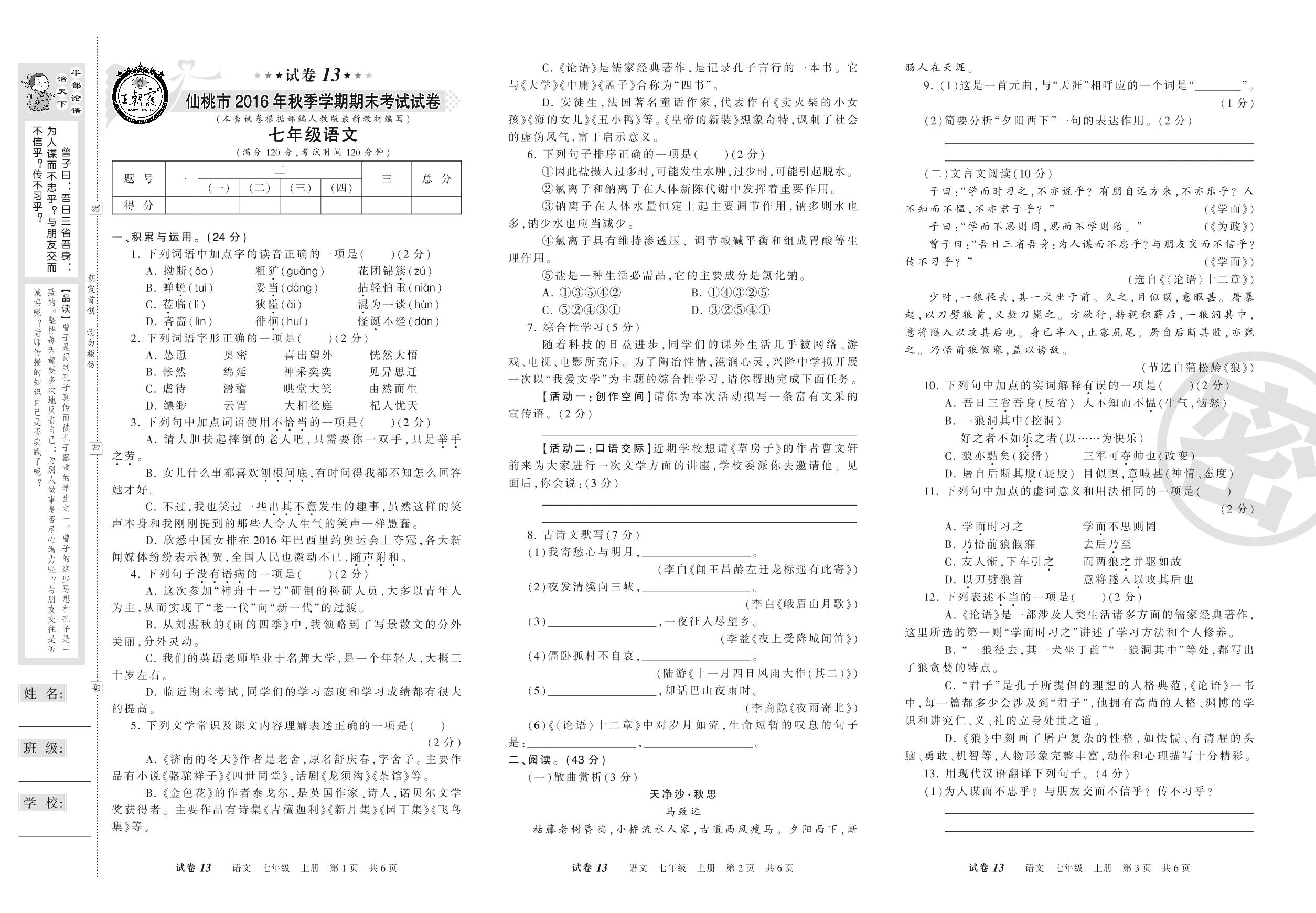 2016-2017学年第一学期仙桃市七年级语文试卷(人教版)【13】