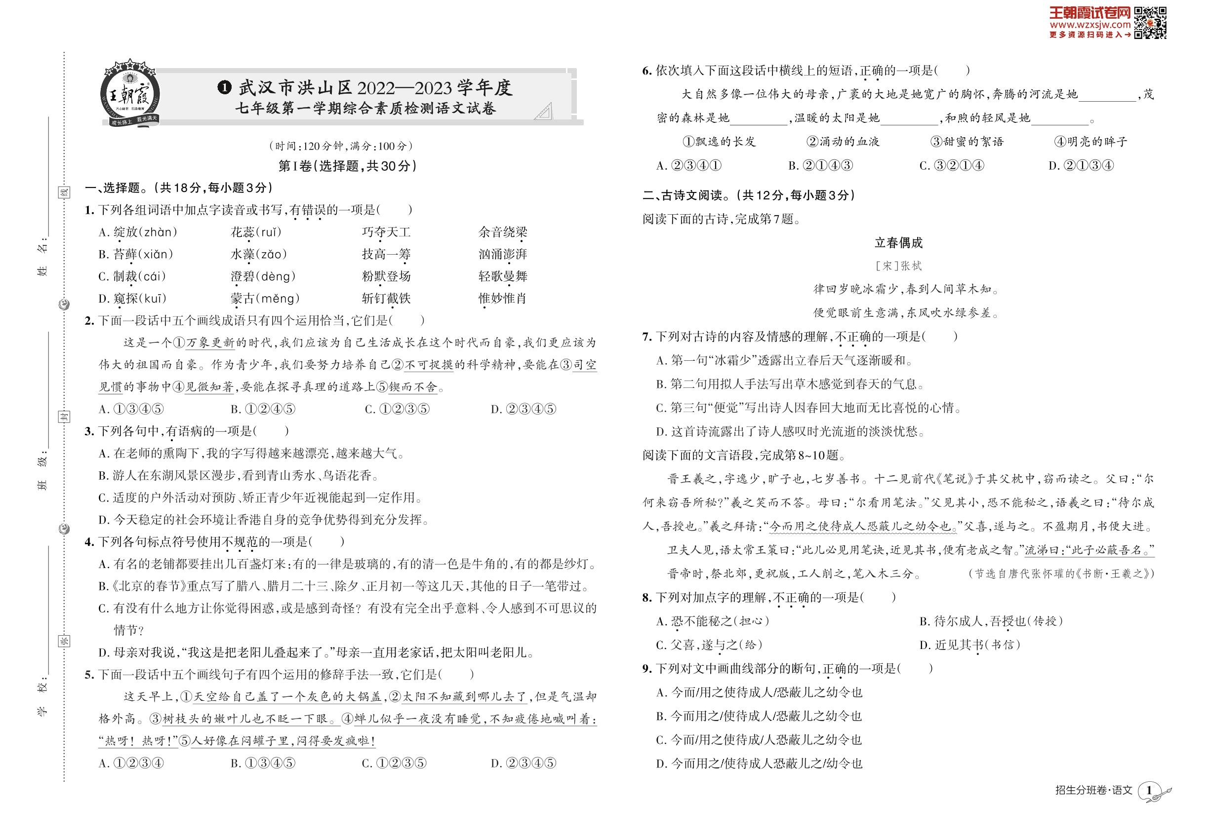 小升初语文武汉市洪山区2022—2023学年度七年级第一学期综合素质检测语文试卷【1】