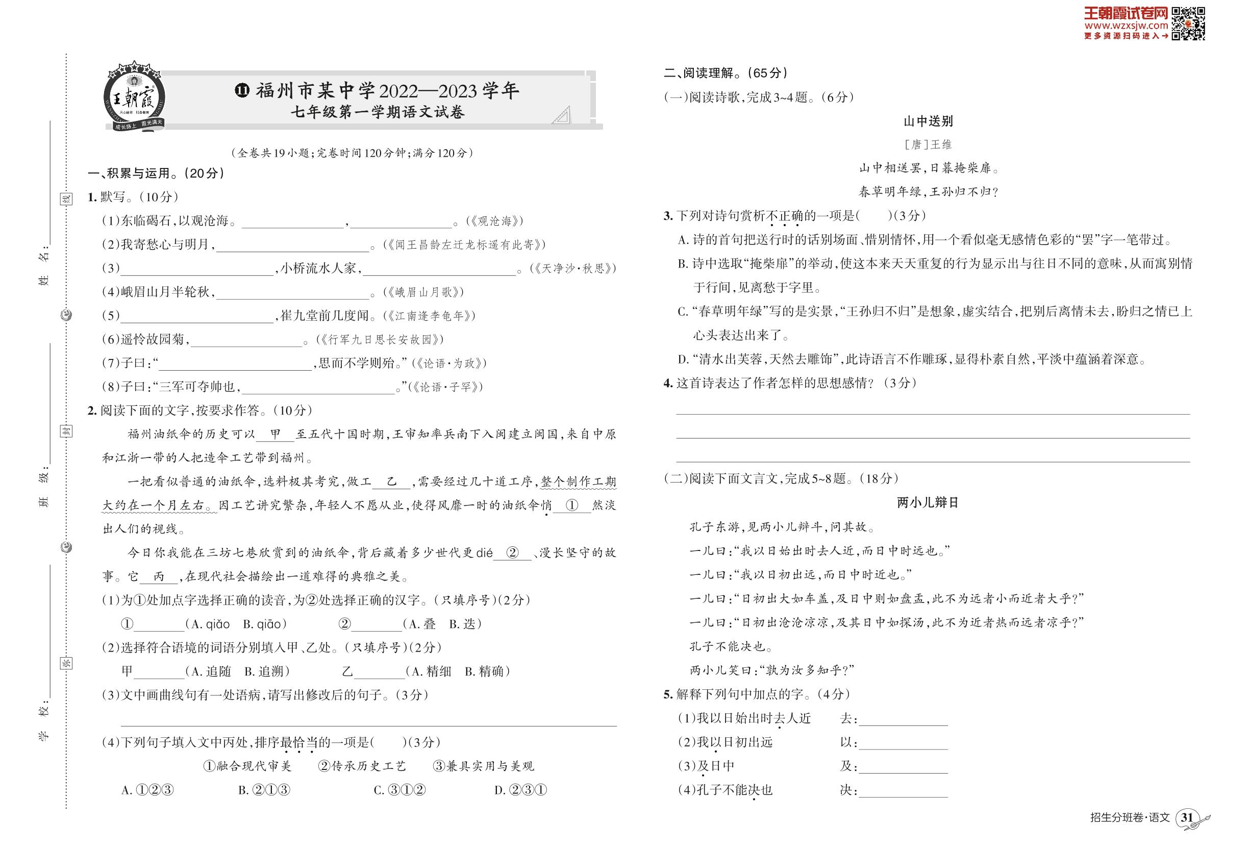 小升初语文福州市某中学2022—2023学年七年级第一学期语文试卷【11】