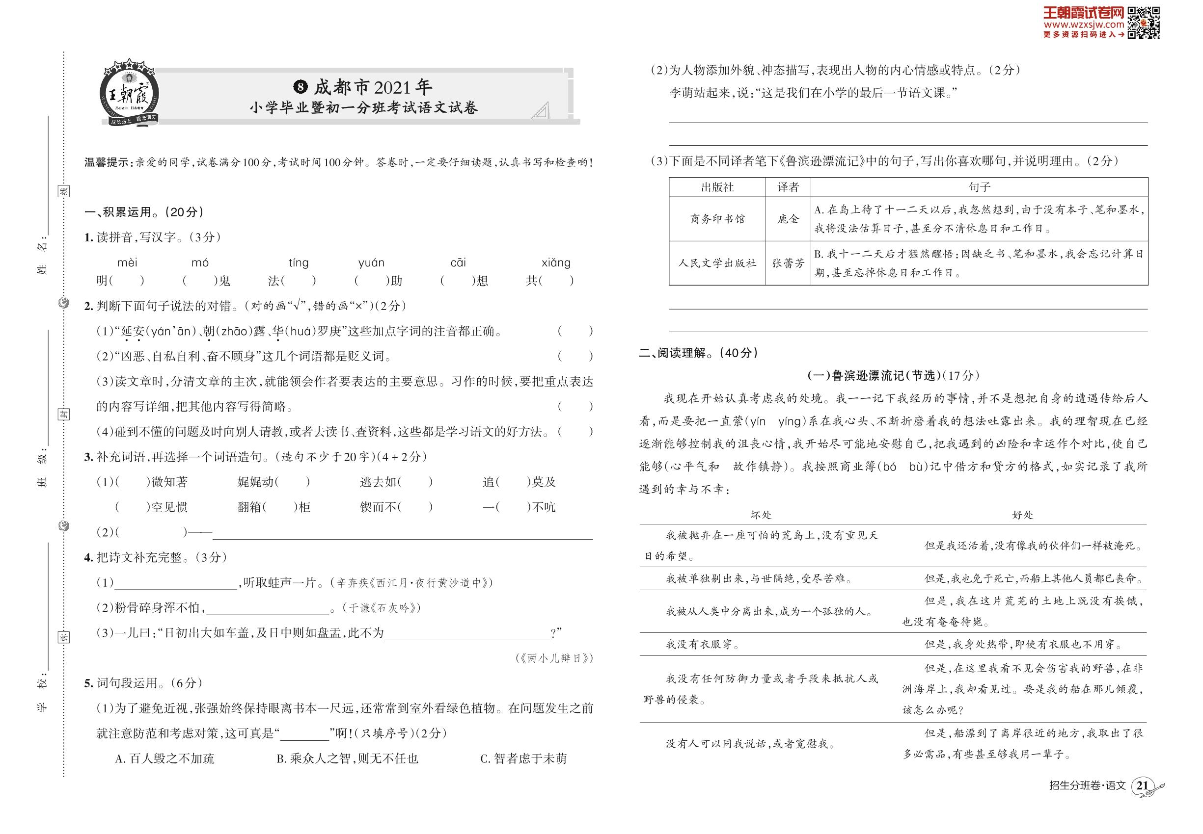 小升初语文成都市2021年小学毕业暨初一分班考试语文试卷【8】