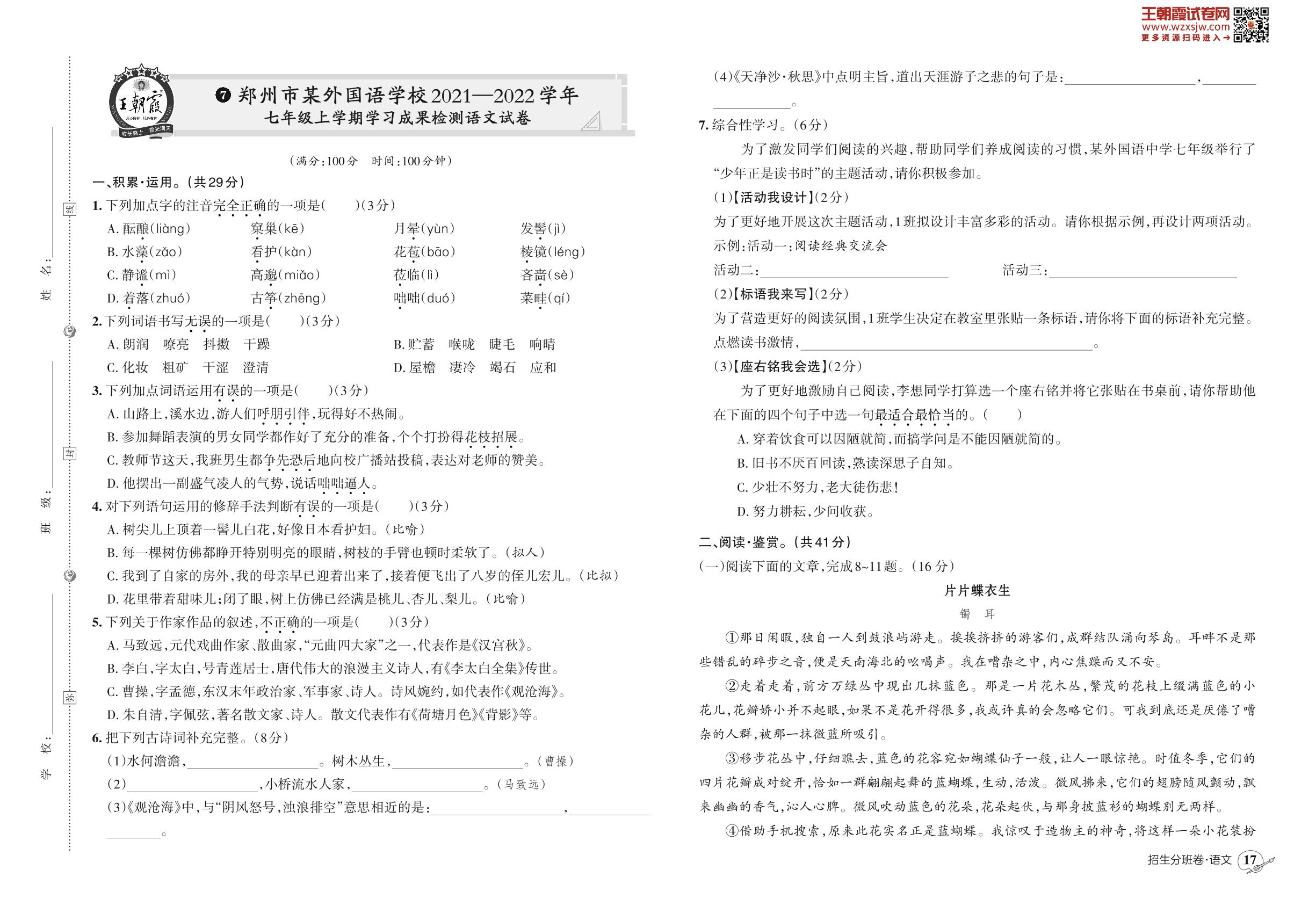 小升初语文郑州市某外国语学校2021—2022学年七年级上学期学习成果检测语文试卷【7】