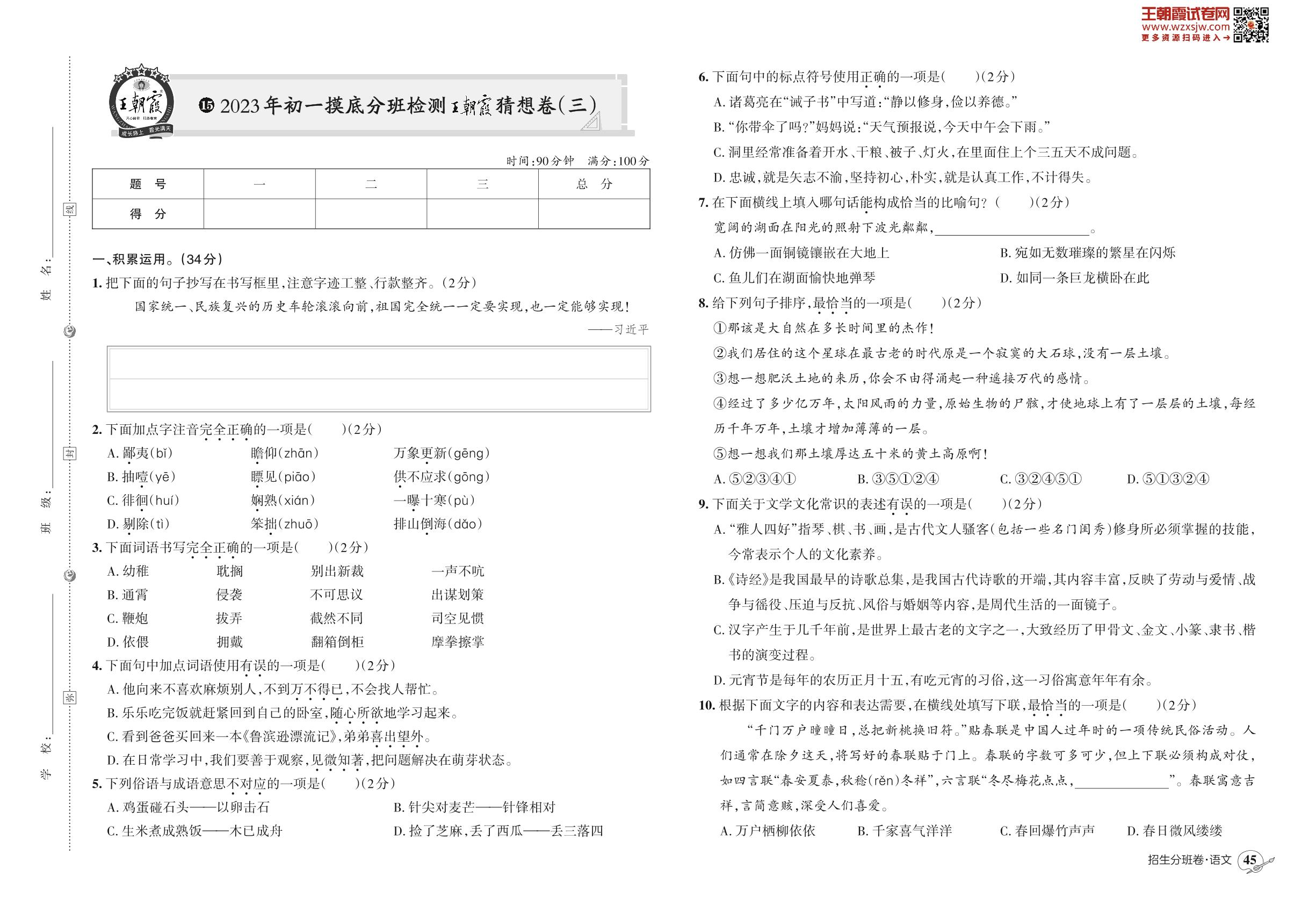 小升初语文初一摸底分班检测王朝霞猜想卷(三)_R221226090445566【15】