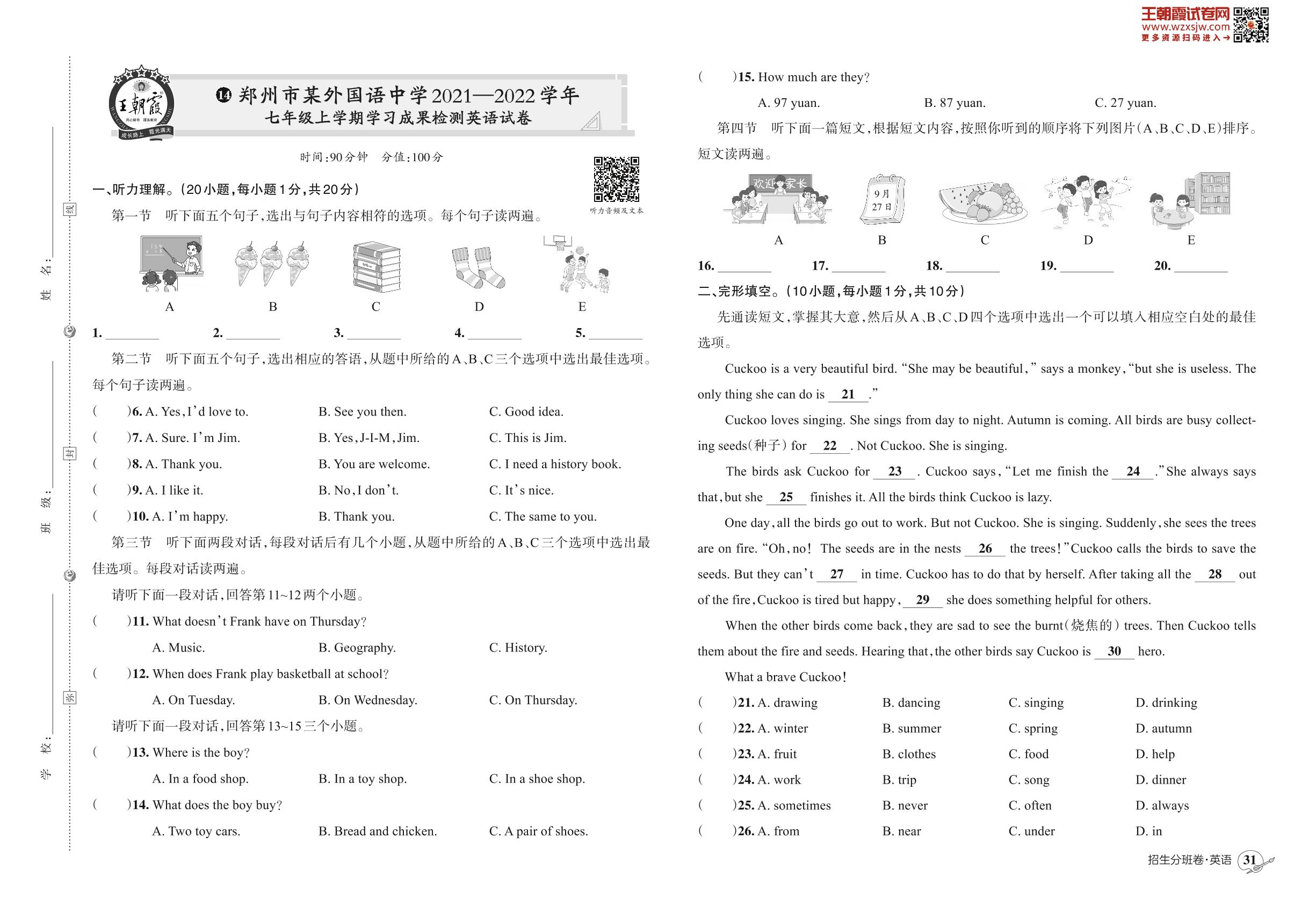 小升初英语郑州市某外国语中学2021—2022学年七年级上学期学习成果检测英语试卷【14】