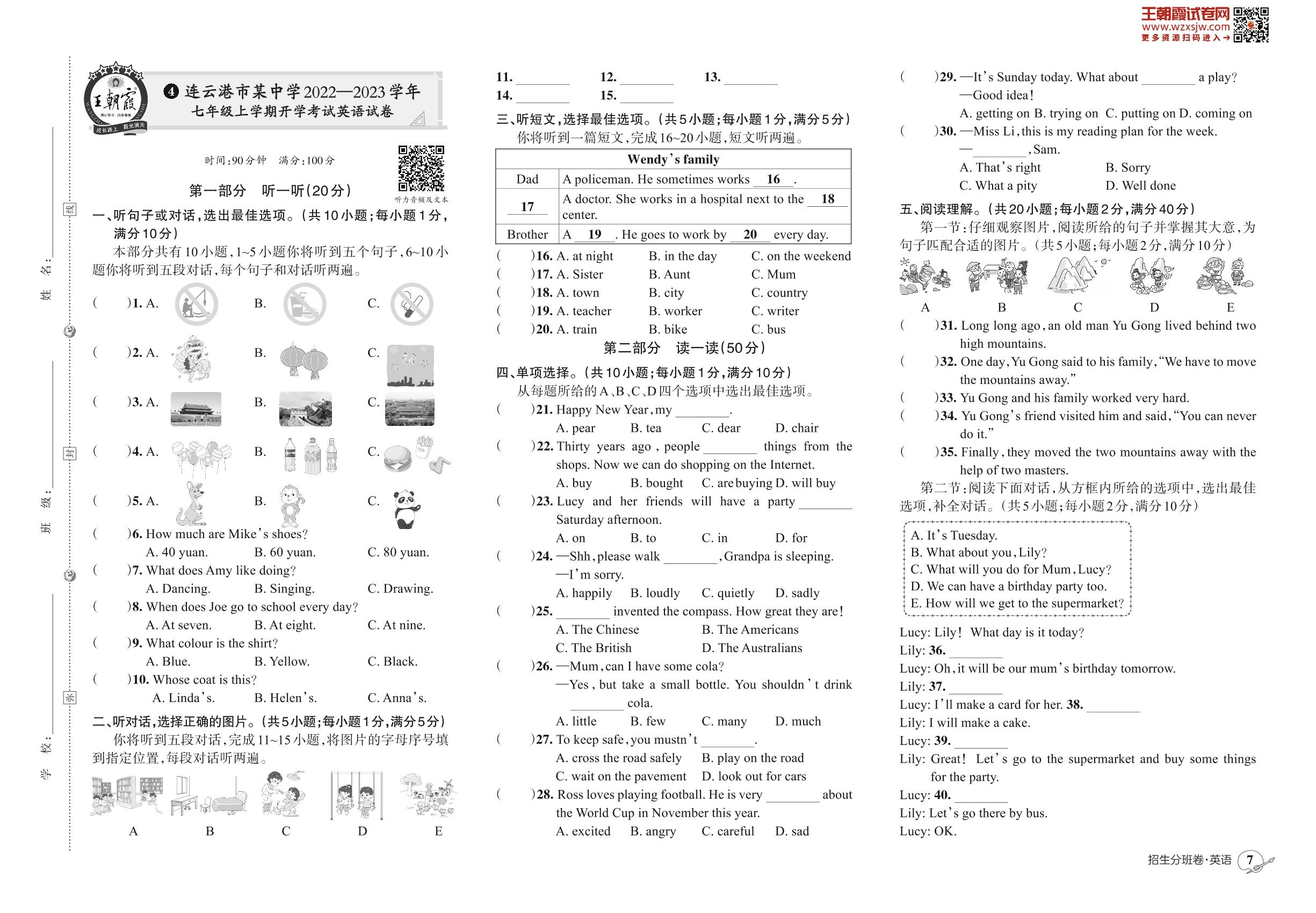 小升初英语连云港市某中学2022—2023学年七年级上学期开学考试英语试卷【4】