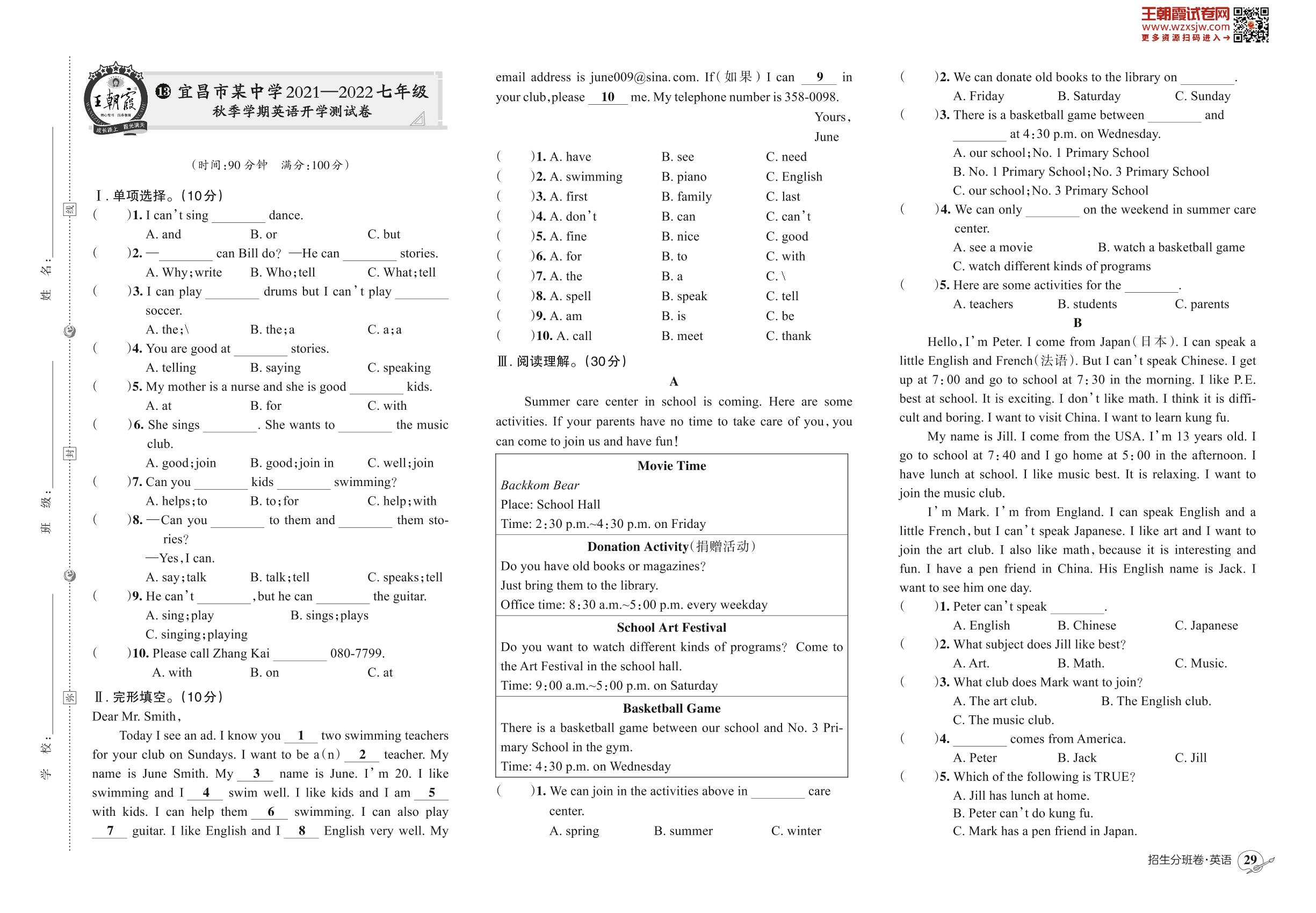 小升初英语宜昌市某中学2021—2022七年级秋季学期英语开学测试卷【13】