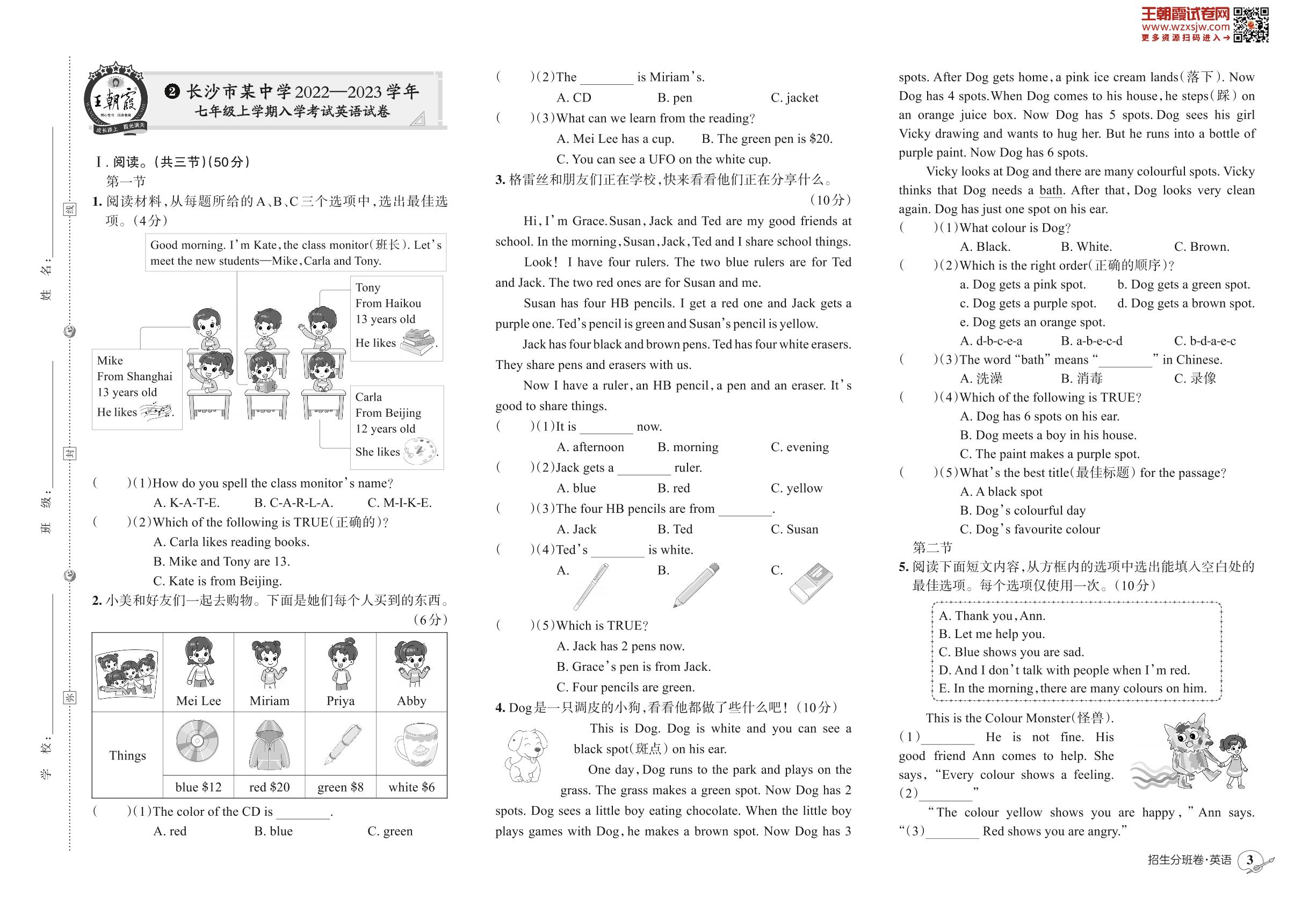 小升初英语长沙市某中学2022—2023学年七年级上学期入学考试英语试卷【2】