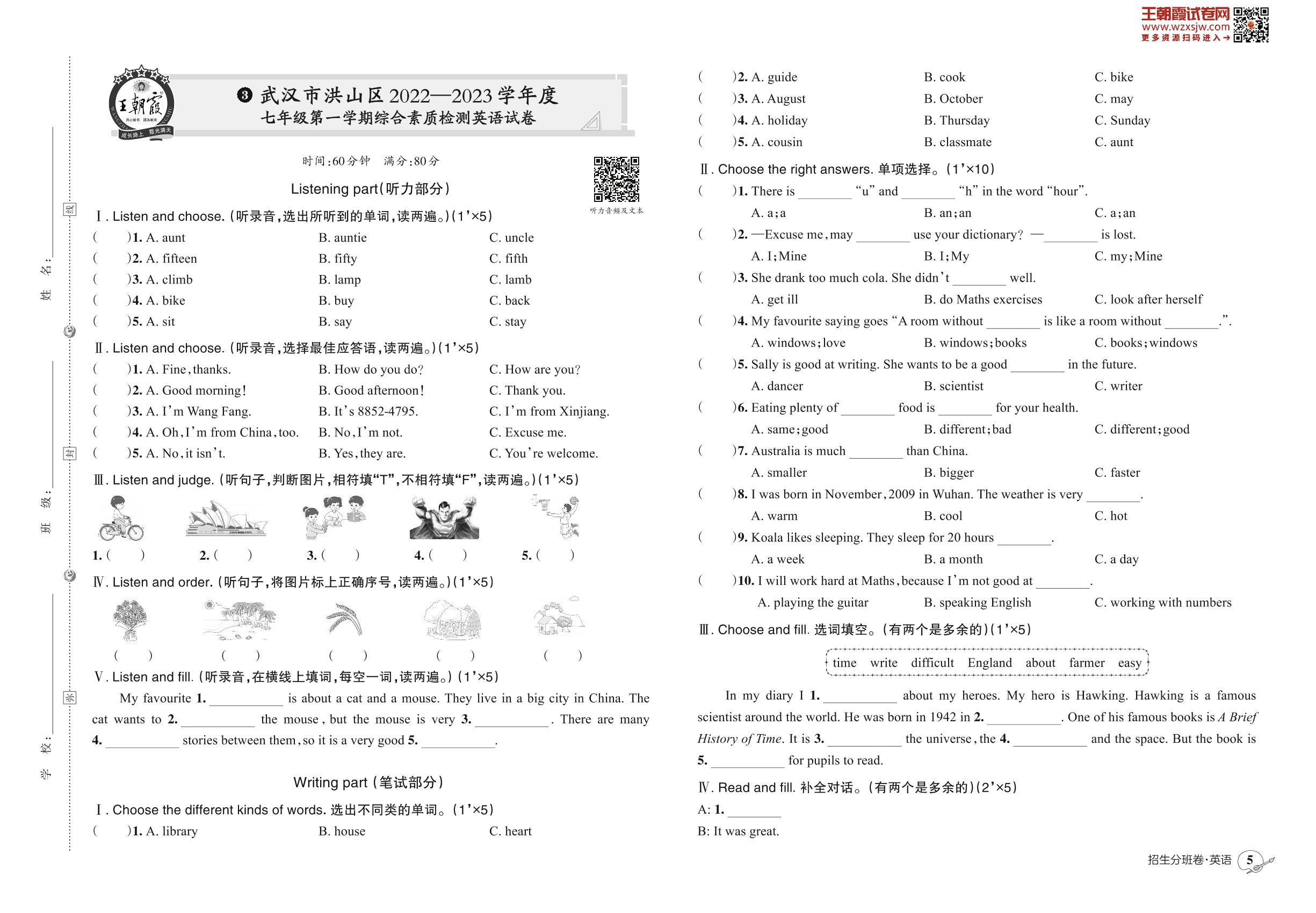 小升初英语武汉市洪山区2022—2023学年度七年级第一学期综合素质检测英语试卷【3】