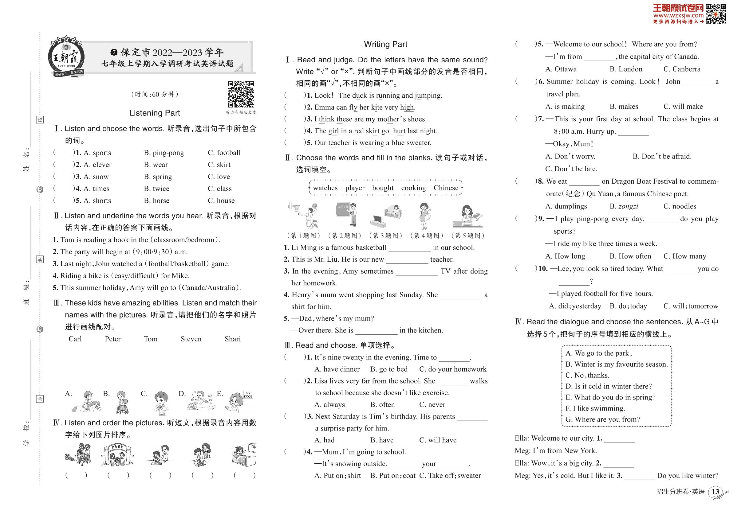 小升初英语保定市2022—2023学年七年级上学期入学调研考试英语试题【7】