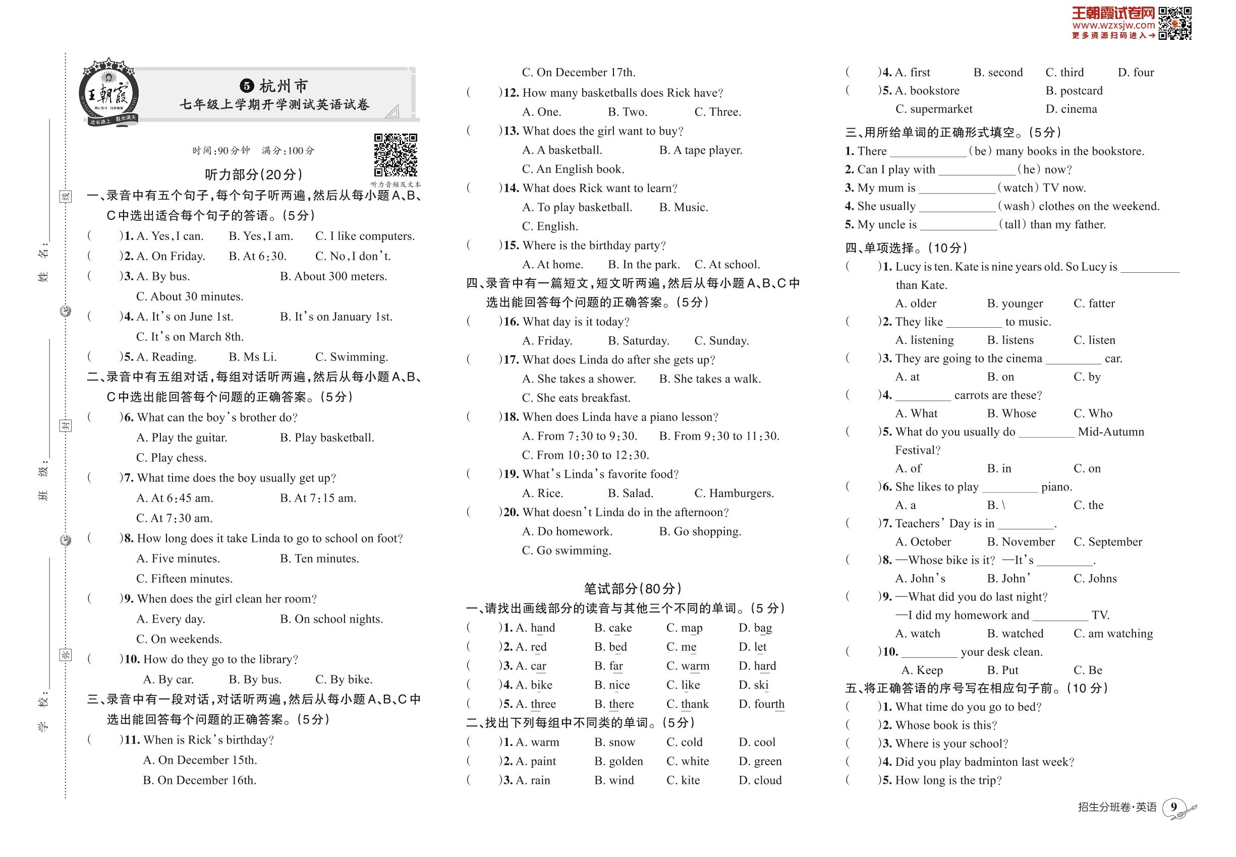 小升初英语杭州市七年级上学期开学测试英语试卷【5】