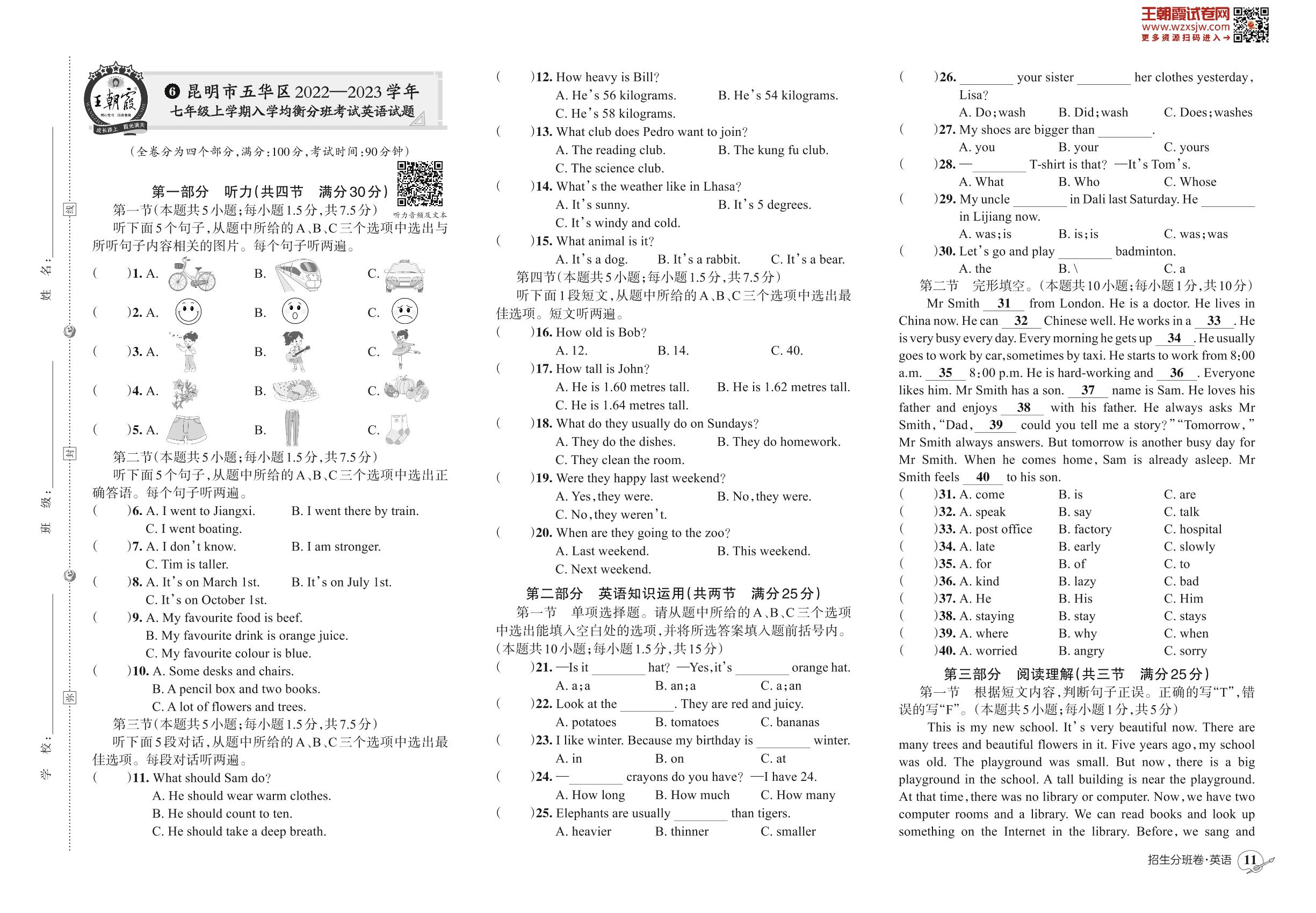 小升初英语昆明市五华区2022—2023学年七年级上学期入学均衡分班考试英语试题【6】