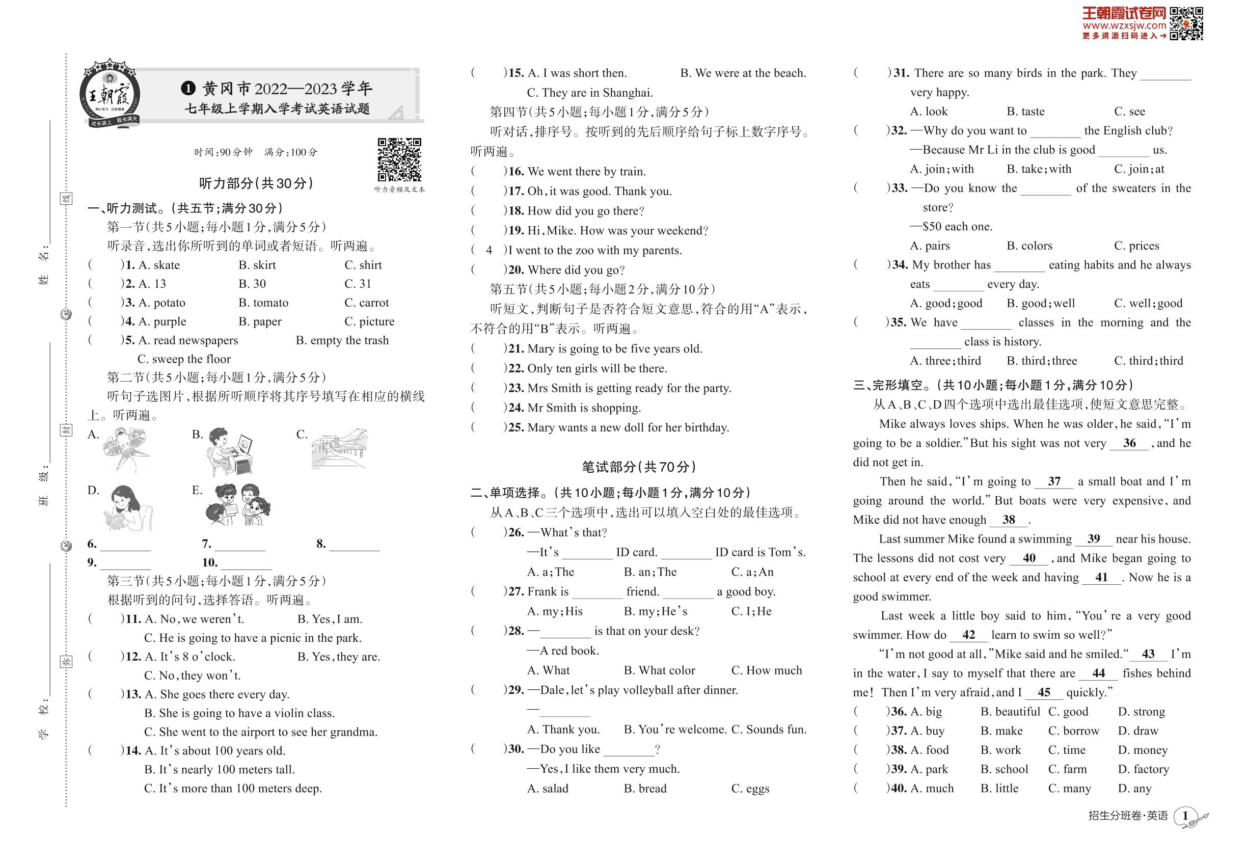 小升初英语黄冈市2022—2023学年七年级上学期入学考试英语试题【1】
