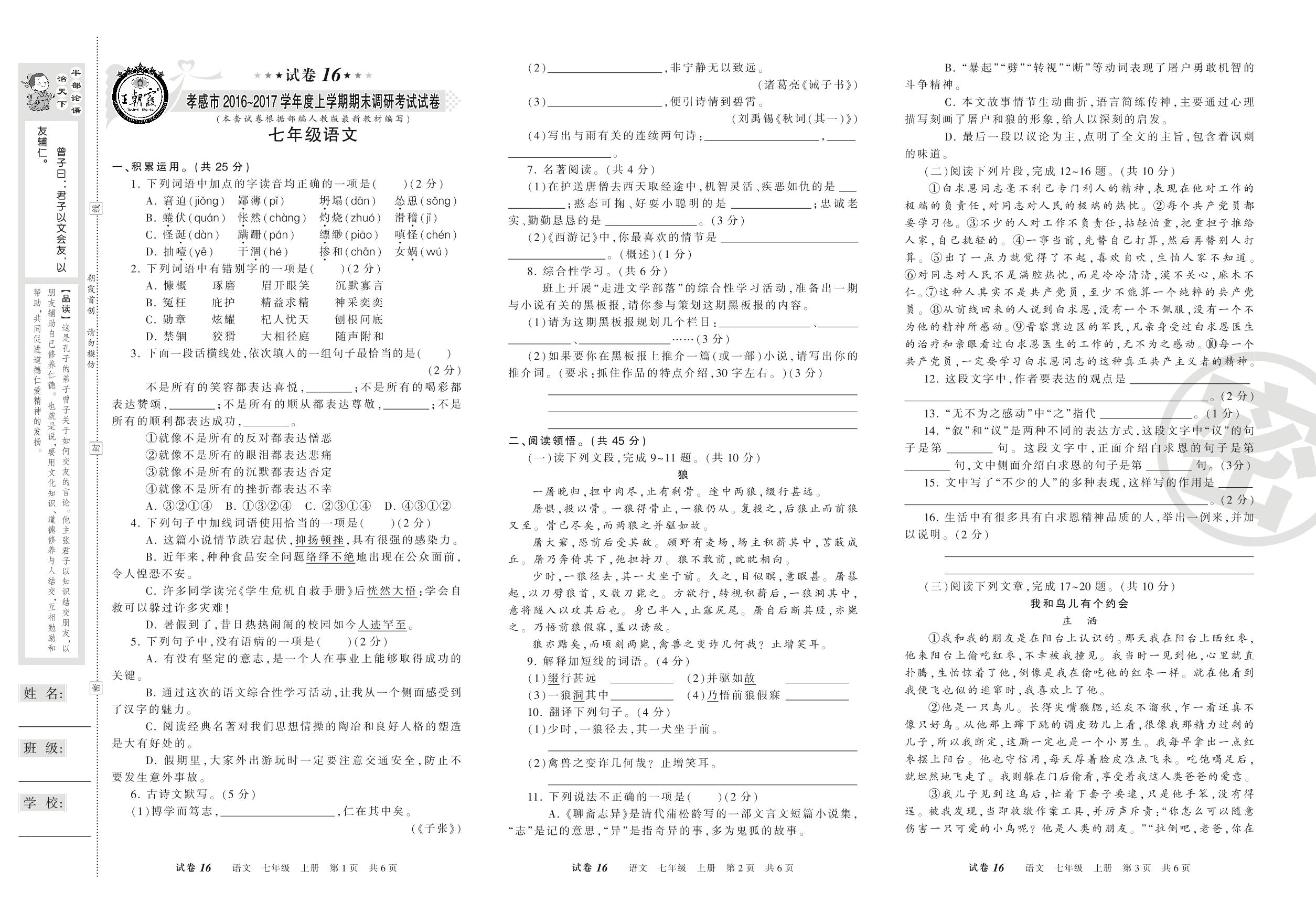 2016-2017学年第一学期孝感市七年级语文试卷(人教版)【16】