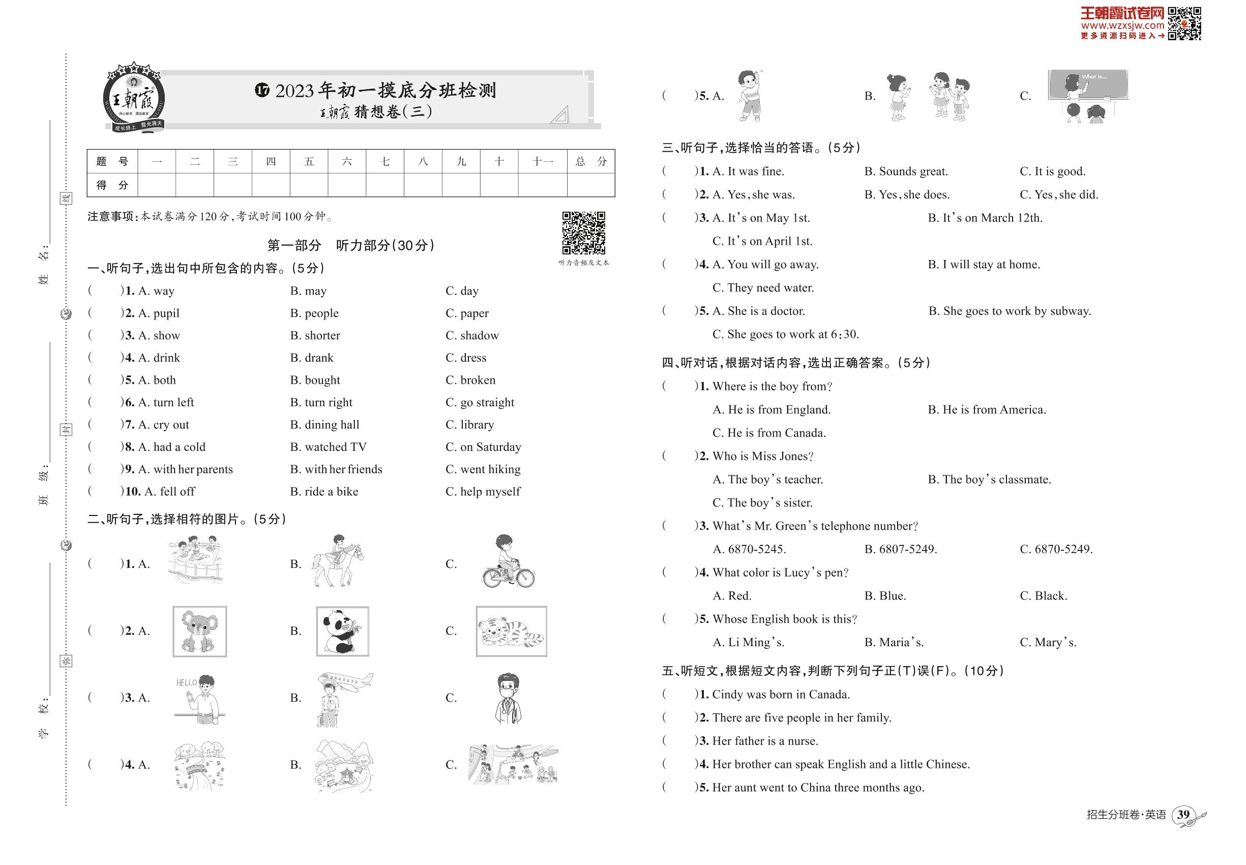 小升初英语初一摸底分班检测王朝霞猜想卷(三)_R221226091716136【17】