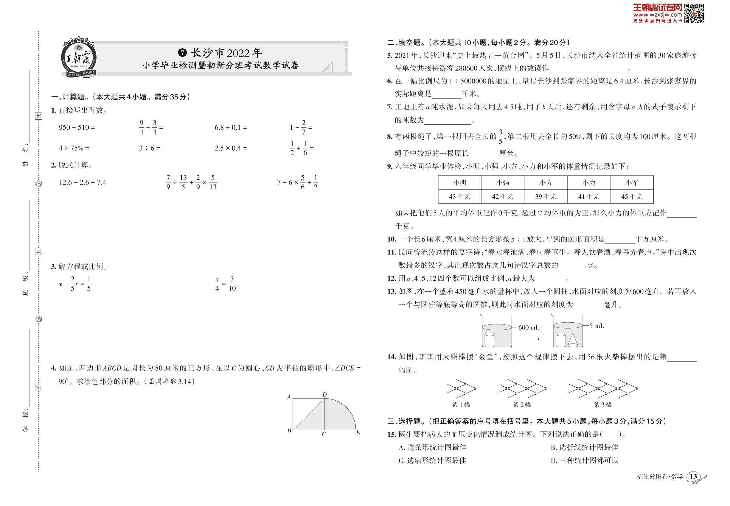 小升初数学长沙市2022年小学毕业检测暨初新分班考试数学试卷【7】