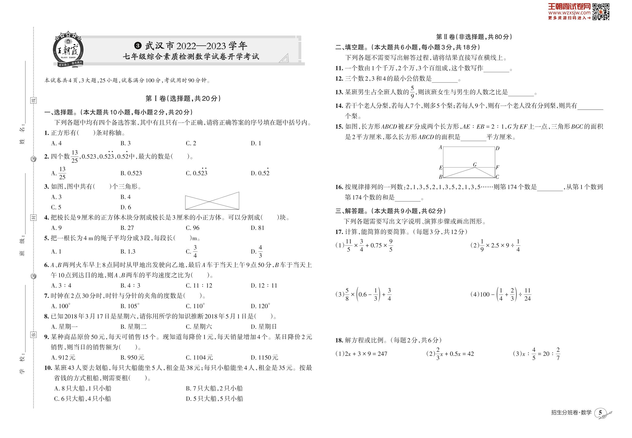 小升初数学武汉市2022—2023学年七年级综合素质检测数学试卷开学考试【3】