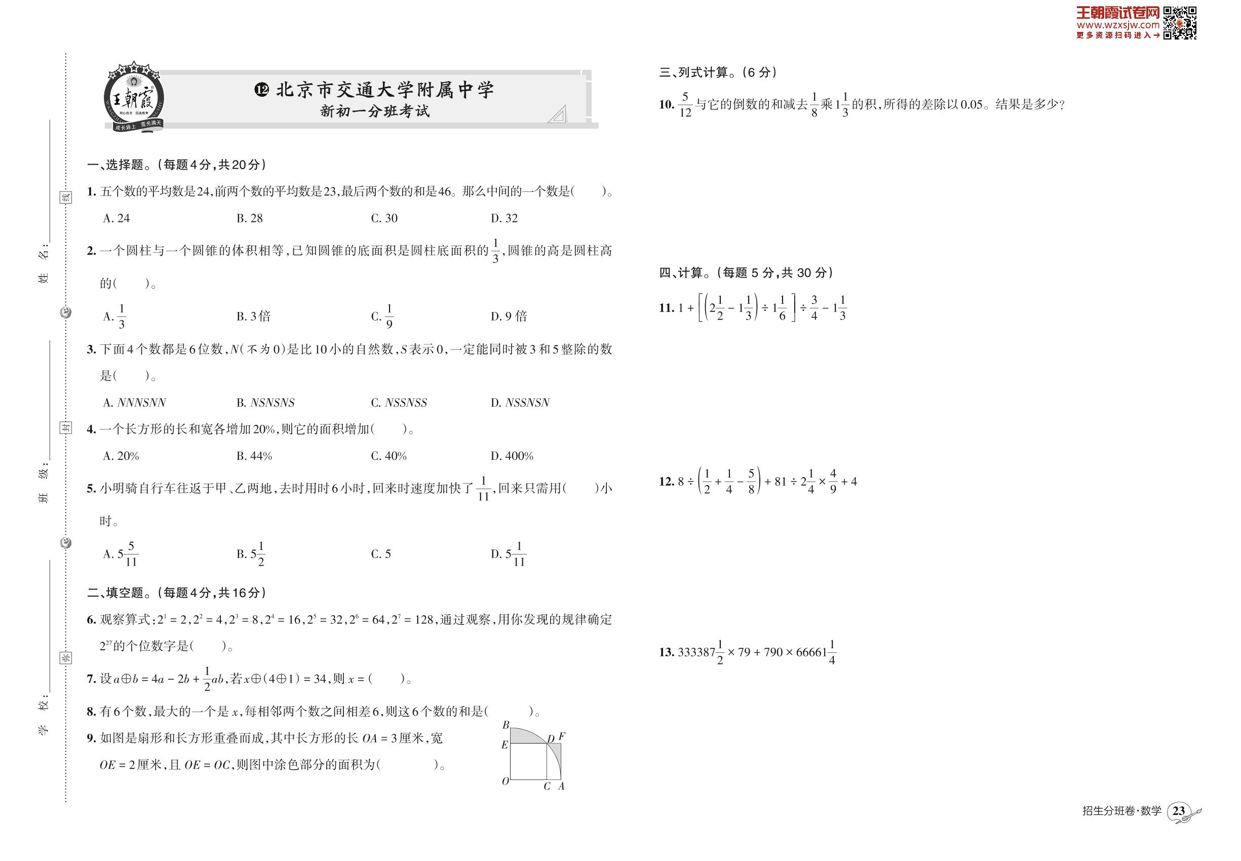 小升初数学北京市交通大学附属中学新初一分班考试【12】