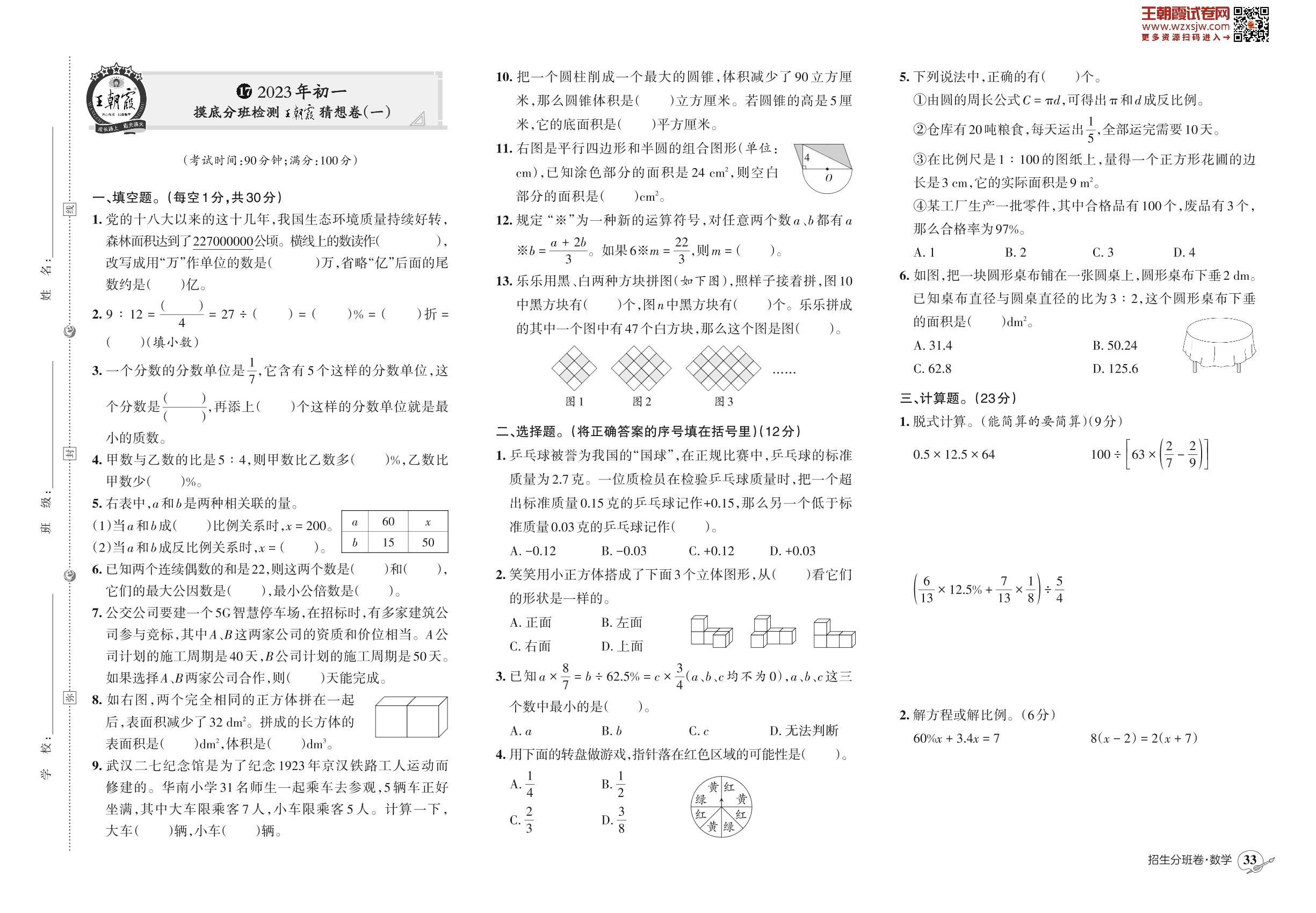 小升初数学初一摸底分班检测王朝霞猜想卷(一)_R221226092533399【17】
