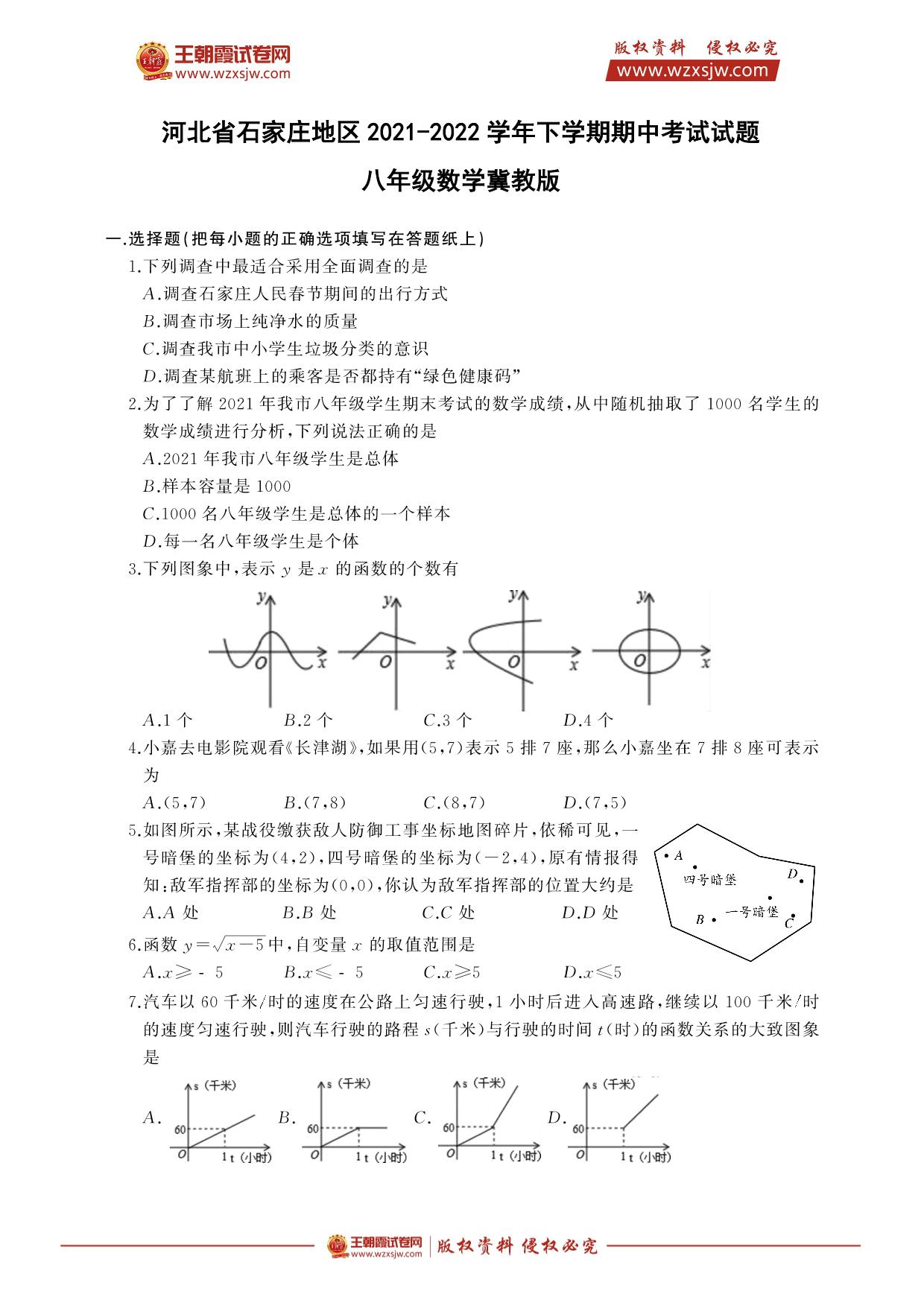 河北省石家庄地区2021-2022学年下学期期中考试试题八年级数学(冀教版)