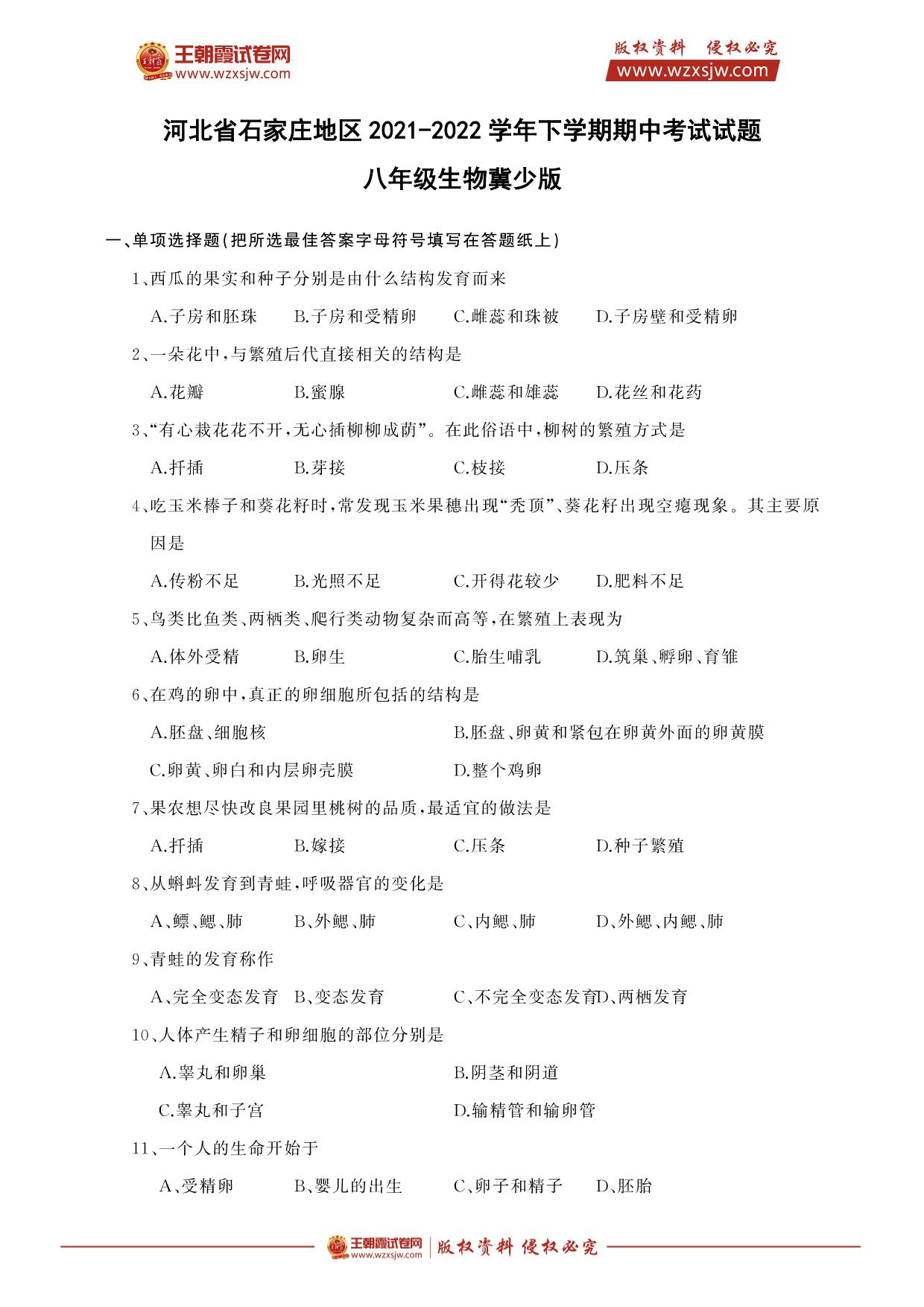 河北省石家庄地区2021-2022学年下学期期中考试试题八年级生物(冀少版)