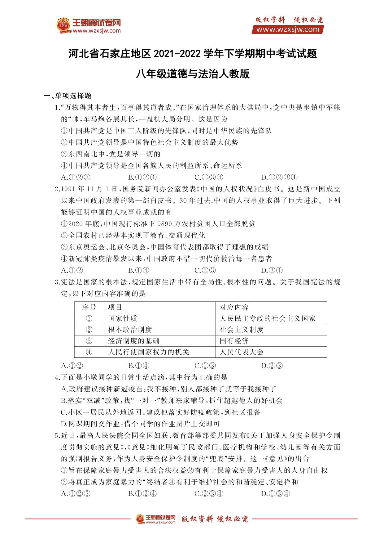 河北省石家庄地区2021-2022学年下学期期中考试试题八年级道德与法治(人教版)