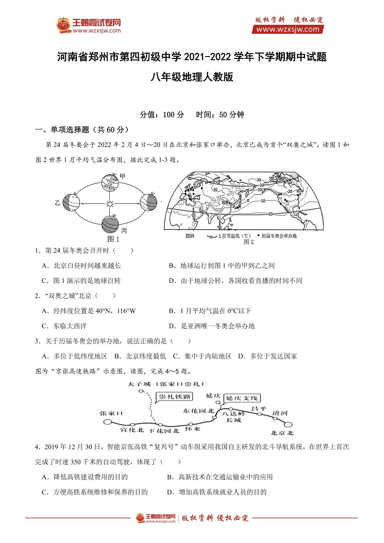 河南省郑州市第四初级中学2021-2022学年下学期期中试题八年级地理(人教版)