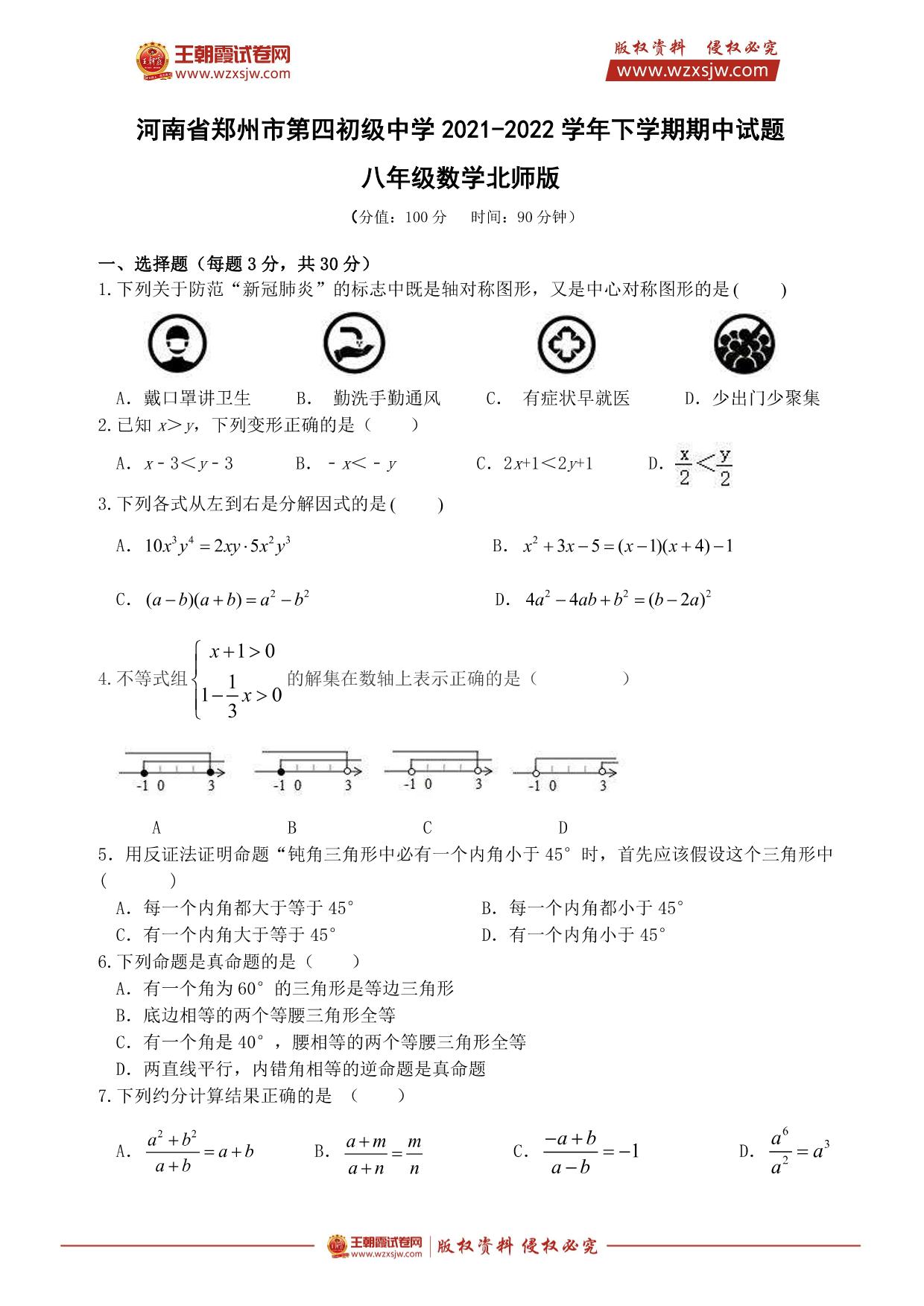 河南省郑州市第四初级中学2021-2022学年下学期期中试题八年级数学(北师版)