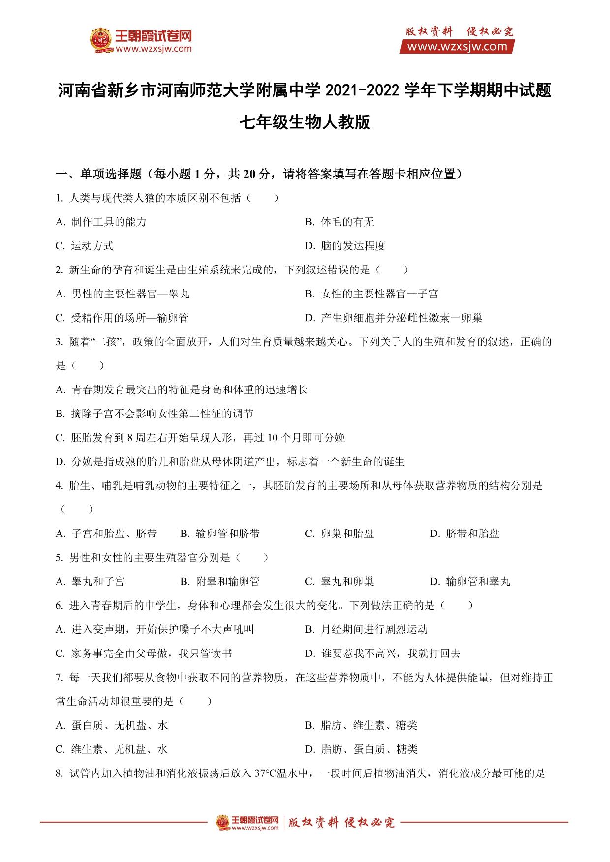 河南省新乡市河南师范大学附属中学2021-2022学年下学期期中试题七年级生物(人教版)