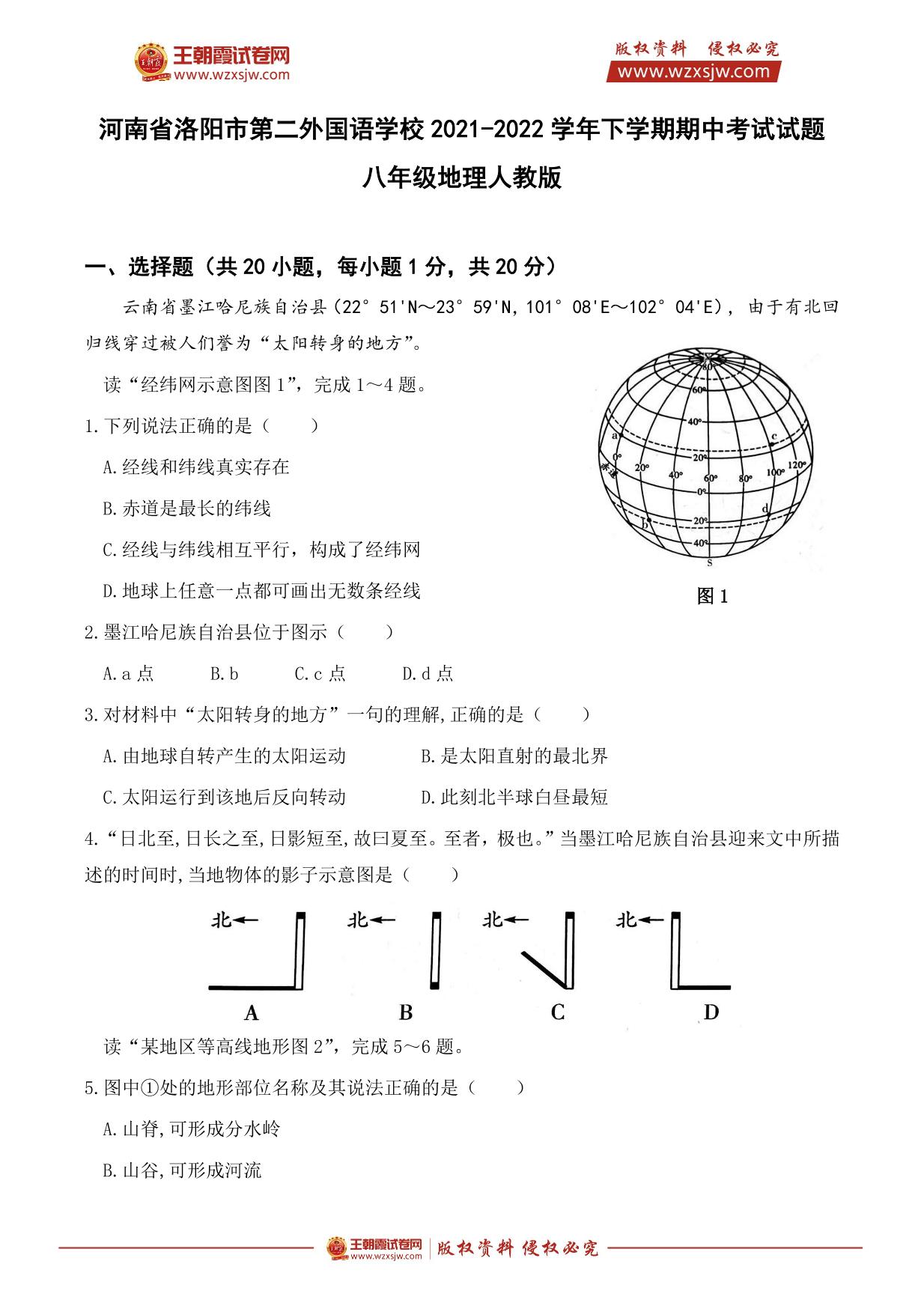河南省洛阳市第二外国语学校2021-2022学年下学期期中考试试题八年级地理(人教版)