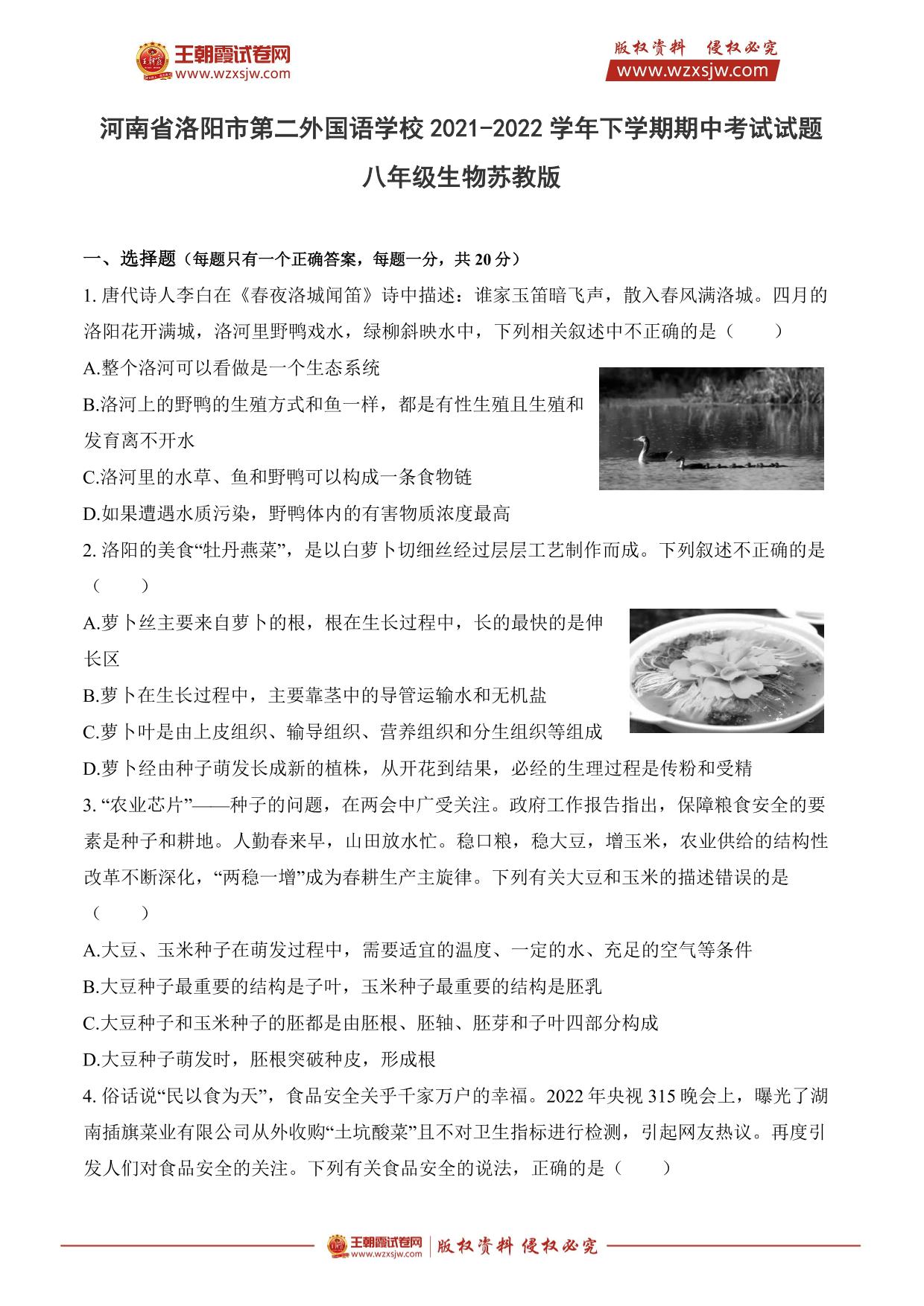 河南省洛阳市第二外国语学校2021-2022学年下学期期中考试试题八年级生物(苏教版)