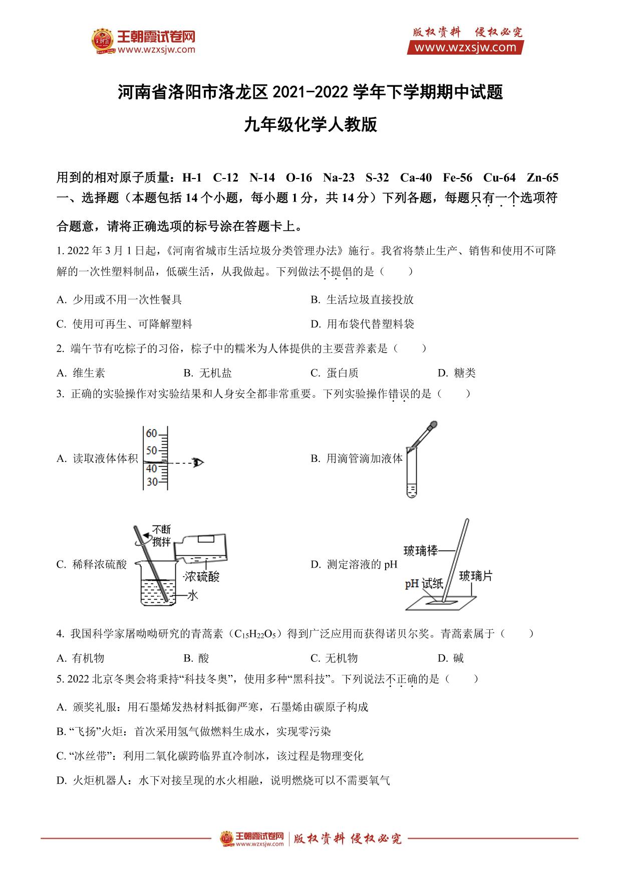 河南省洛阳市洛龙区2021-2022学年下学期期中试题九年级化学(人教版)
