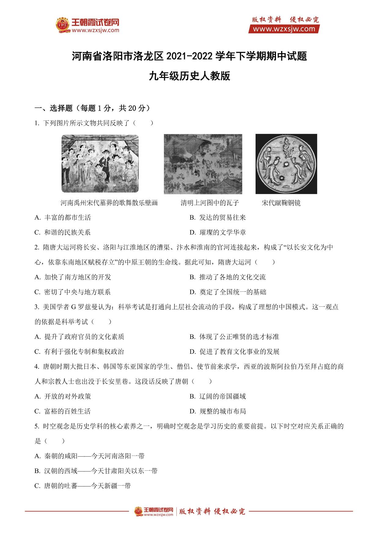 河南省洛阳市洛龙区2021-2022学年下学期期中试题九年级历史(人教版)