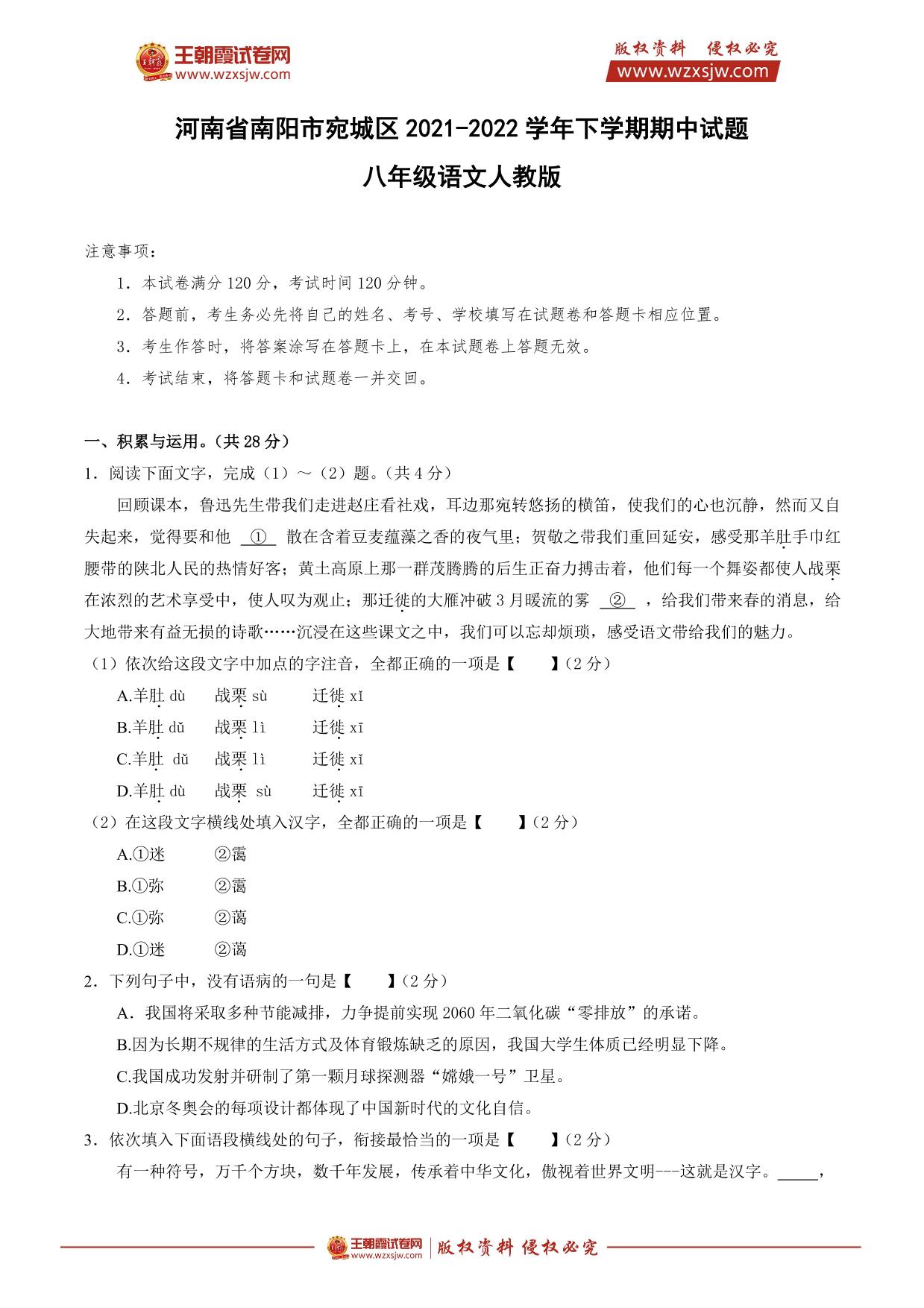 河南省南阳市宛城区2021-2022学年下学期期中试题八年级语文(人教版)
