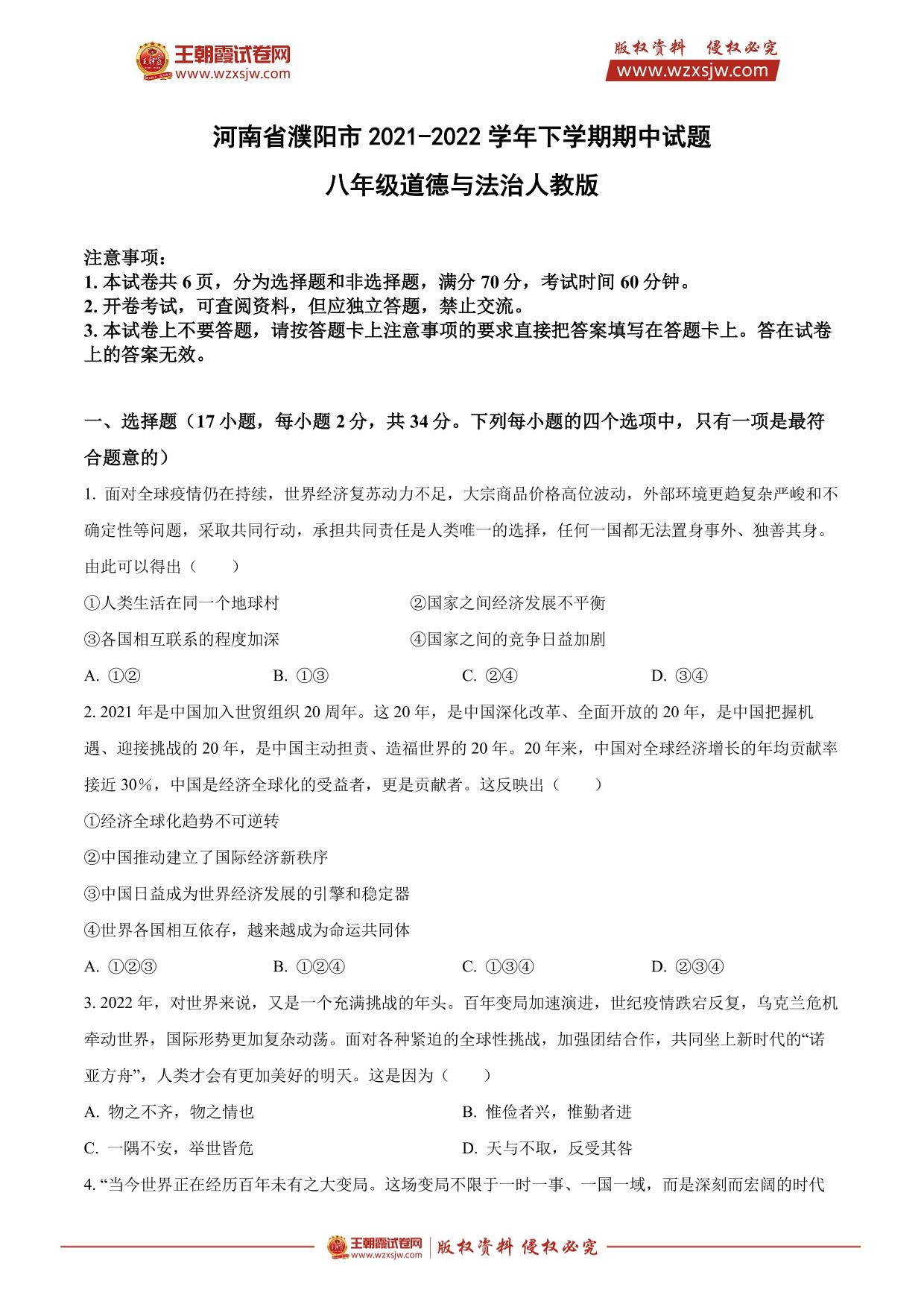 河南省濮阳市2021-2022学年下学期期中试题八年级道德与法治(人教版)