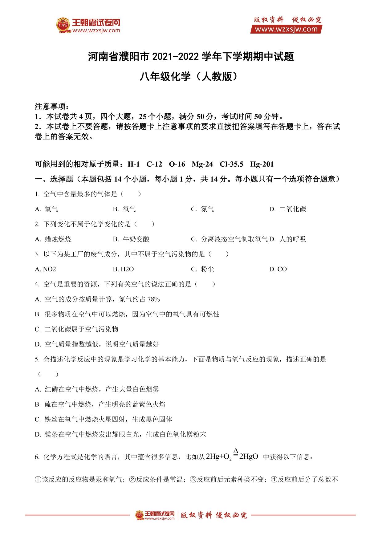 河南省濮阳市2021-2022学年下学期期中试题八年级化学(人教版)