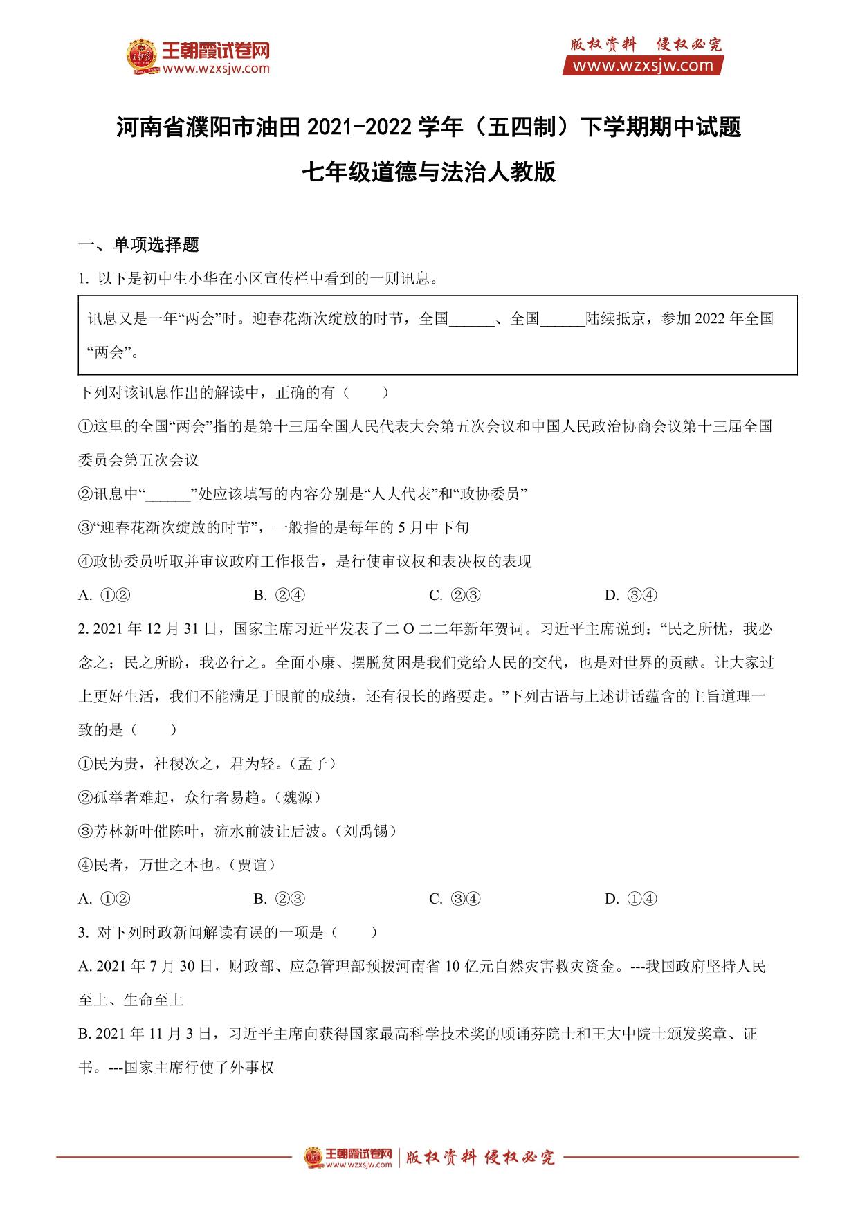 河南省濮阳市油田2021-2022学年(五四制)下学期期中试题七年级道德与法治(人教版)