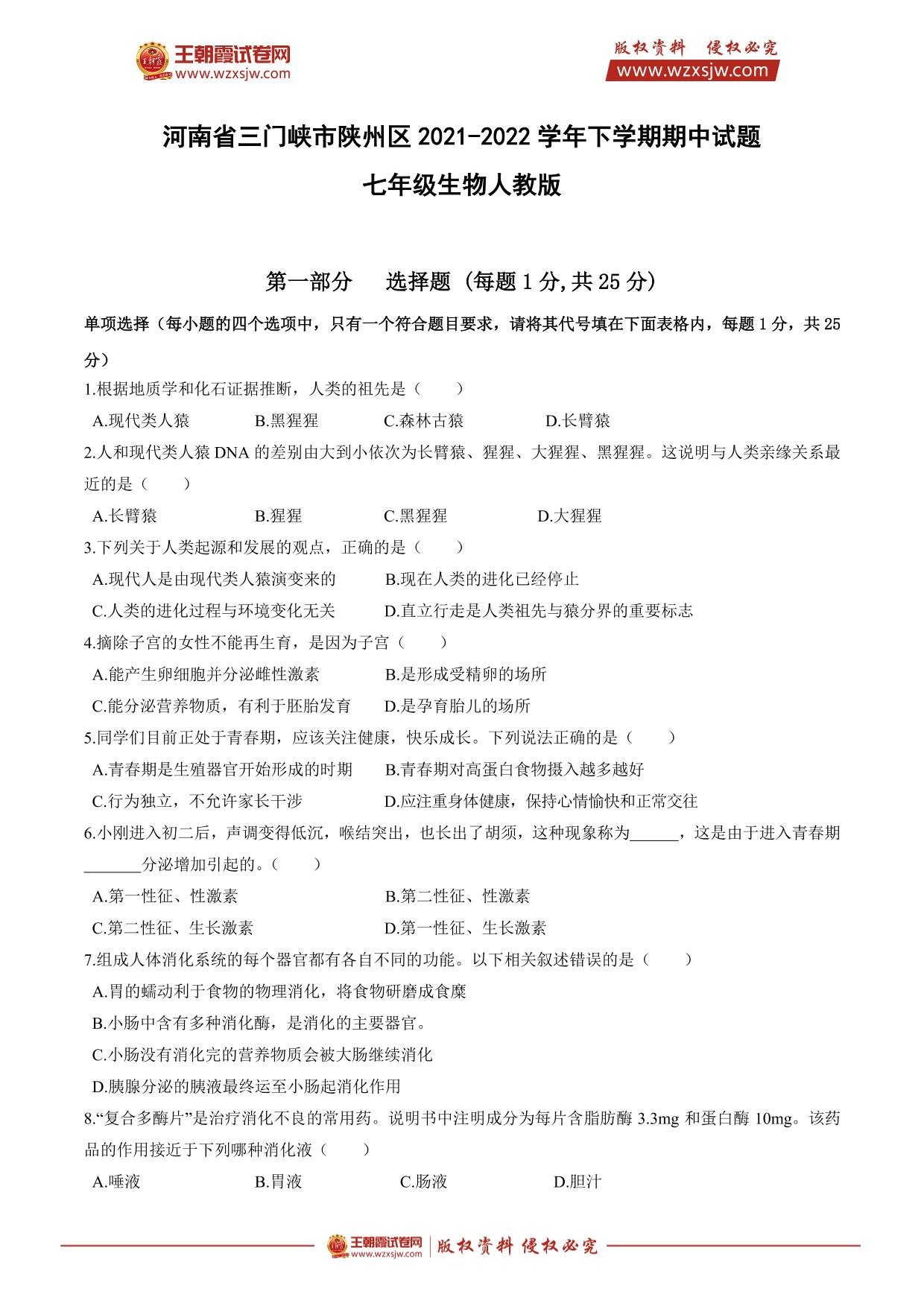 河南省三门峡市陕州区2021-2022学年下学期期中试题七年级生物(人教版)