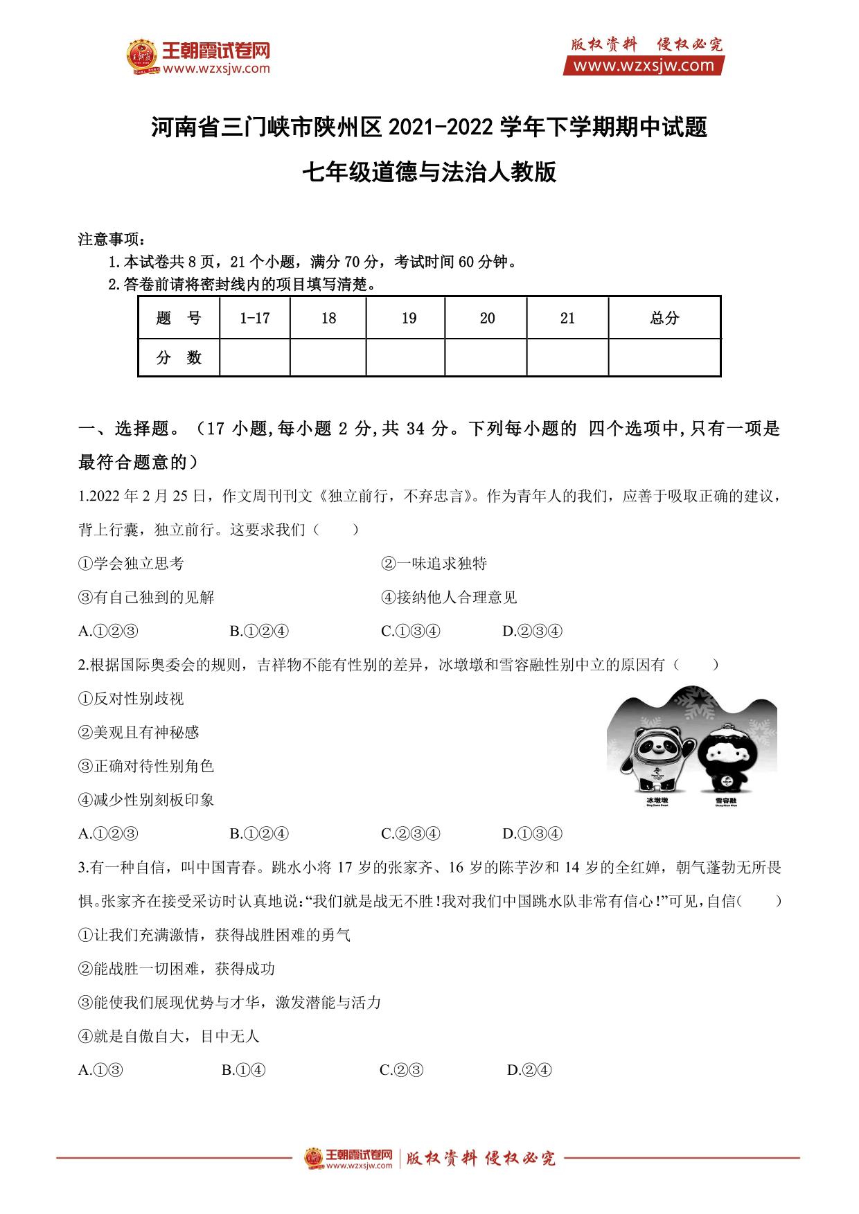 河南省三门峡市陕州区2021-2022学年下学期期中试题七年级道德与法治(人教版)